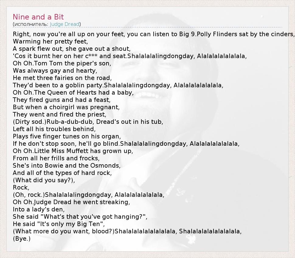 Right, now you're all up on your feet, you can listen to Big 9.Polly Flinders sat by the cinders, Warming her pretty feet, A spark flew out, she gave out a shout, 'Cos it burnt her on her c*** and seat.Shalalalalingdongday, Alalalalalalalala, Oh Oh.Tom Tom the piper's son, Was always gay and hearty, He met three fairies on the road, They'd been to a goblin party.Shalalalalingdongday, Alalalalalalalala, Oh Oh.The Queen of Hearts had a baby, They fired guns and had a feast, But when a choirgirl was pregnant, They went and fired the priest, (Dirty sod.)Rub-a-dub-dub, Dread's out in his tub, Left all his troubles behind, Plays five finger tunes on his organ, If he don't stop soon, he'll go blind.Shalalalalingdongday, Alalalalalalalala, Oh Oh.Little Miss Muffett has grown up, From all her frills and frocks, She's into Bowie and the Osmonds, And all of the types of hard rock, (What did you say?), Rock, (Oh, rock.)Shalalalalingdongday, Alalalalalalalala, Oh Oh.Judge Dread he went streaking, Into a lady's den, She said "What's that you've got hanging?", He said "It's only my Big Ten", (What more do you want, blood?)Shalalalalalalalalala, Shalalalalalalalalala, (Bye.)
