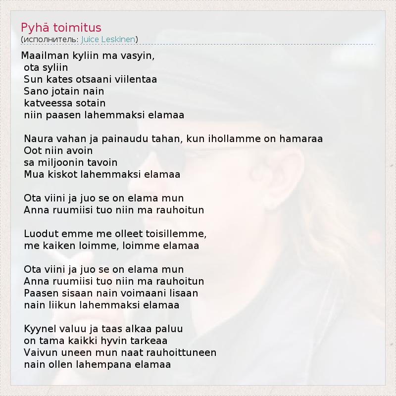 А как ты думаешь, о чем песня "Pyhä toimitus" ?