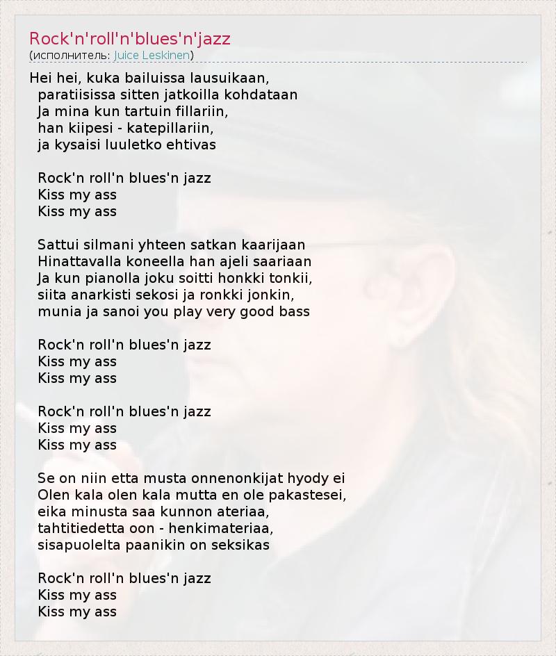 Hei hei, kuka bailuissa lausuikaan, paratiisissa sitten jatkoilla kohdataan Ja mina kun tartuin fillariin, han kiipesi - katepillariin, ja kysaisi luuletko ehtivas Rock'n roll'n blues'n jazz Kiss my ass Kiss my ass Sattui silmani yhteen satkan kaarijaan Hinattavalla koneella han ajeli saariaan Ja kun pianolla joku soitti honkki tonkii, siita anarkisti sekosi ja ronkki jonkin, munia ja sanoi you play very good bass Rock'n roll'n blues'n jazz Kiss my ass Kiss my ass Rock'n roll'n blues'n jazz Kiss my ass Kiss my ass Se on niin etta musta onnenonkijat hyody ei Olen kala olen kala mutta en ole pakastesei, eika minusta saa kunnon ateriaa, tahtitiedetta oon - henkimateriaa, sisapuolelta paanikin on seksikas Rock'n roll'n blues'n jazz Kiss my ass Kiss my ass