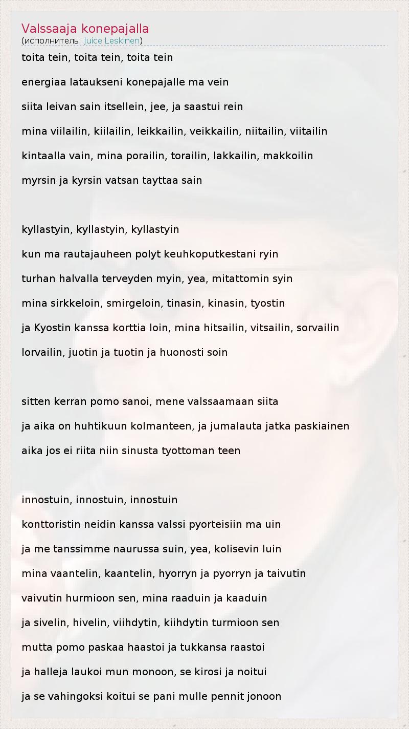 А как ты думаешь, о чем песня "Valssaaja konepajalla" ?