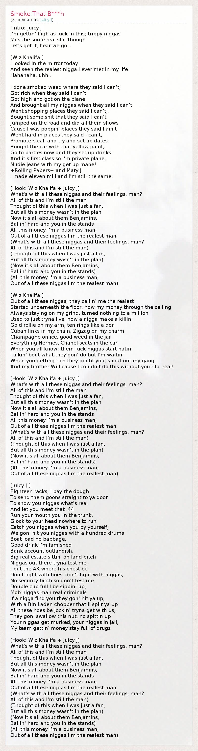[Intro: Juicy J] I'm gettin' high as fuck in this; trippy niggas Must be some real shit though Let's get it, hear we go... [Wiz Khalifa:] I looked in the mirror today And seen the realest nigga I ever met in my life Hahahaha, uhh... I done smoked weed where they said I can't, Got rich when they said I can't Got high and got on the plane And brought all my niggas when they said I can't Went shopping places they said I can't, Bought some shit that they said I can't Jumped on the road and did all them shows Cause I was poppin' places they said I ain't Went hard in places they said I can't, Promoters call and try and set up dates Bought the car with that yellow paint, Go to parties now and they set up drinks And it's first class so I'm private plane, Nudie jeans with my get up mane! +Rolling Papers+ and Mary J; I made eleven mill and I'm still the same [Hook: Wiz Khalifa + Juicy J] What's with all these niggas and their feelings, man? All of this and I'm still the man Thought of this when I was just a fan, But all this money wasn't in the plan Now it's all about them Benjamins, Ballin' hard and you in the stands All this money I'm a business man; Out of all these niggas I'm the realest man (What's with all these niggas and their feelings, man? All of this and I'm still the man) (Thought of this when I was just a fan, But all this money wasn't in the plan) (Now it's all about them Benjamins, Ballin' hard and you in the stands) (All this money I'm a business man; Out of all these niggas I'm the realest man) [Wiz Khalifa:] Out of all these niggas, they callin' me the realest Started underneath the floor, now my money through the ceiling Always staying on my grind, turned nothing to a million Used to just tryna live, now a nigga make a killin' Gold rollie on my arm, ten rings like a don Cuban links in my chain, Zigzag on my charm Champagne on ice, good weed in the jar Everything Hermes, Chanel seats in the car When you all know; them fuck niggas start hatin' Talkin' bout what they gon' do but I'm waitin' When you getting rich they doubt you; shout out my gang And my brother Will cause I couldn't do this without you - fo' real! [Hook: Wiz Khalifa + Juicy J] What's with all these niggas and their feelings, man? All of this and I'm still the man Thought of this when I was just a fan, But all this money wasn't in the plan Now it's all about them Benjamins, Ballin' hard and you in the stands All this money I'm a business man; Out of all these niggas I'm the realest man (What's with all these niggas and their feelings, man? All of this and I'm still the man) (Thought of this when I was just a fan, But all this money wasn't in the plan) (Now it's all about them Benjamins, Ballin' hard and you in the stands) (All this money I'm a business man; Out of all these niggas I'm the realest man) [Juicy J:] Eighteen racks, I pay the dough To send them goons straight to ya door To show you niggas what's real And let you meet that .44 Run your mouth you in the trunk, Glock to your head nowhere to run Catch you niggas when you by yourself, We gon' hit you niggas with a hundred drums Boat load no babbage, Good drink I'm famished Bank account outlandish, Big real estate sittin' on land bitch Niggas out there tryna test me, I put the AK where his chest be Don't fight with hoes, don't fight with niggas, No security bitch so don't test me Double cup full I be sippin' up, Mob niggas man real criminals If a nigga find you they gon' hit ya up, With a Bin Laden chopper that'll split ya up All these hoes be jockin' tryna get with us, They gon' swallow this nut, no spittin up Your niggas get murked, your niggas in jail, My team gettin' money stay full of drugs [Hook: Wiz Khalifa + Juicy J] What's with all these niggas and their feelings, man? All of this and I'm still the man Thought of this when I was just a fan, But all this money wasn't in the plan Now it's all about them Benjamins, Ballin' hard and you in the stands All this money I'm a business man; Out of all these niggas I'm the realest man (What's with all these niggas and their feelings, man? All of this and I'm still the man) (Thought of this when I was just a fan, But all this money wasn't in the plan) (Now it's all about them Benjamins, Ballin' hard and you in the stands) (All this money I'm a business man; Out of all these niggas I'm the realest man)