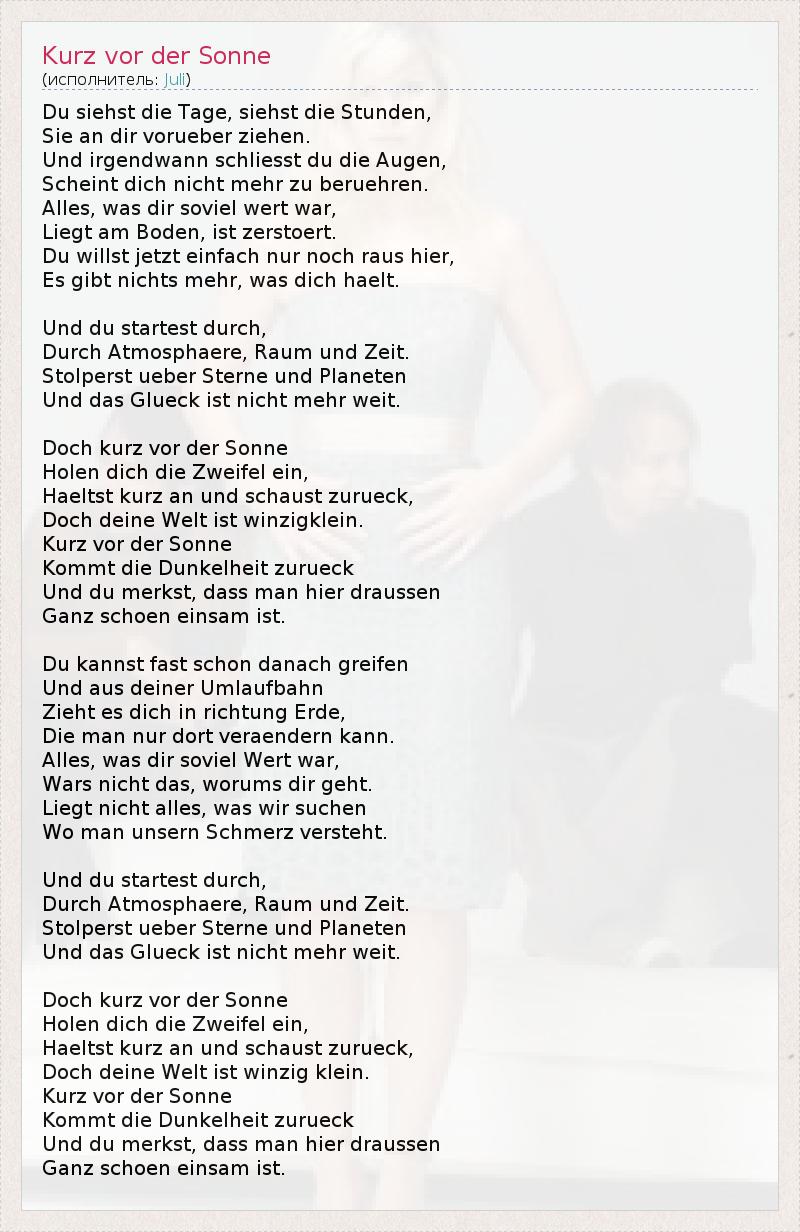 А как ты думаешь, о чем песня "Kurz vor der Sonne" ?