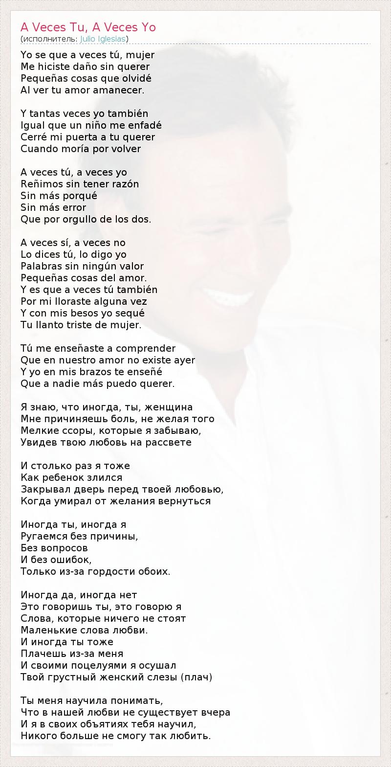 Yo se que a veces tú, mujer Me hiciste daño sin querer Pequeñas cosas que olvidé Al ver tu amor amanecer. Y tantas veces yo también Igual que un niño me enfadé Cerré mi puerta a tu querer Cuando moría por volver A veces tú, a veces yo Reñimos sin tener razón Sin más porqué Sin más error Que por orgullo de los dos. A veces sí, a veces no Lo dices tú, lo digo yo Palabras sin ningún valor Pequeñas cosas del amor. Y es que a veces tú también Por mi lloraste alguna vez Y con mis besos yo sequé Tu llanto triste de mujer. Tú me enseñaste a comprender Que en nuestro amor no existe ayer Y yo en mis brazos te enseñé Que a nadie más puedo querer. Я знаю, что иногда, ты, женщина Мне причиняешь боль, не желая того Мелкие ссоры, которые я забываю, Увидев твою любовь на рассвете И столько раз я тоже Как ребенок злился Закрывал дверь перед твоей любовью, Когда умирал от желания вернуться Иногда ты, иногда я Ругаемся без причины, Без вопросов И без ошибок, Только из-за гордости обоих. Иногда да, иногда нет Это говоришь ты, это говорю я Слова, которые ничего не стоят Маленькие слова любви. И иногда ты тоже Плачешь из-за меня И своими поцелуями я осушал Твой грустный женский слезы (плач) Ты меня научила понимать, Что в нашей любви не существует вчера И я в своих объятиях тебя научил, Никого больше не смогу так любить.