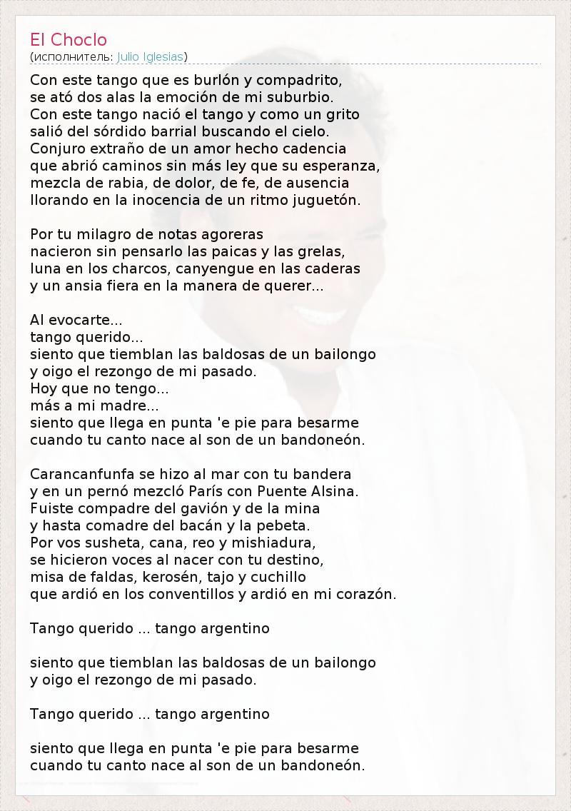 «Эль Чокло» - название самого известного танго, переводиться также как "кочерыжка кукурузы", и имело фаллический смысл. Это название раньше связывали с изначальной темой танго, а именно - намеками на секс и непристойности. Когда танго стал общественной нормой, этот танец и его лирика были очищены или полностью изменены.
