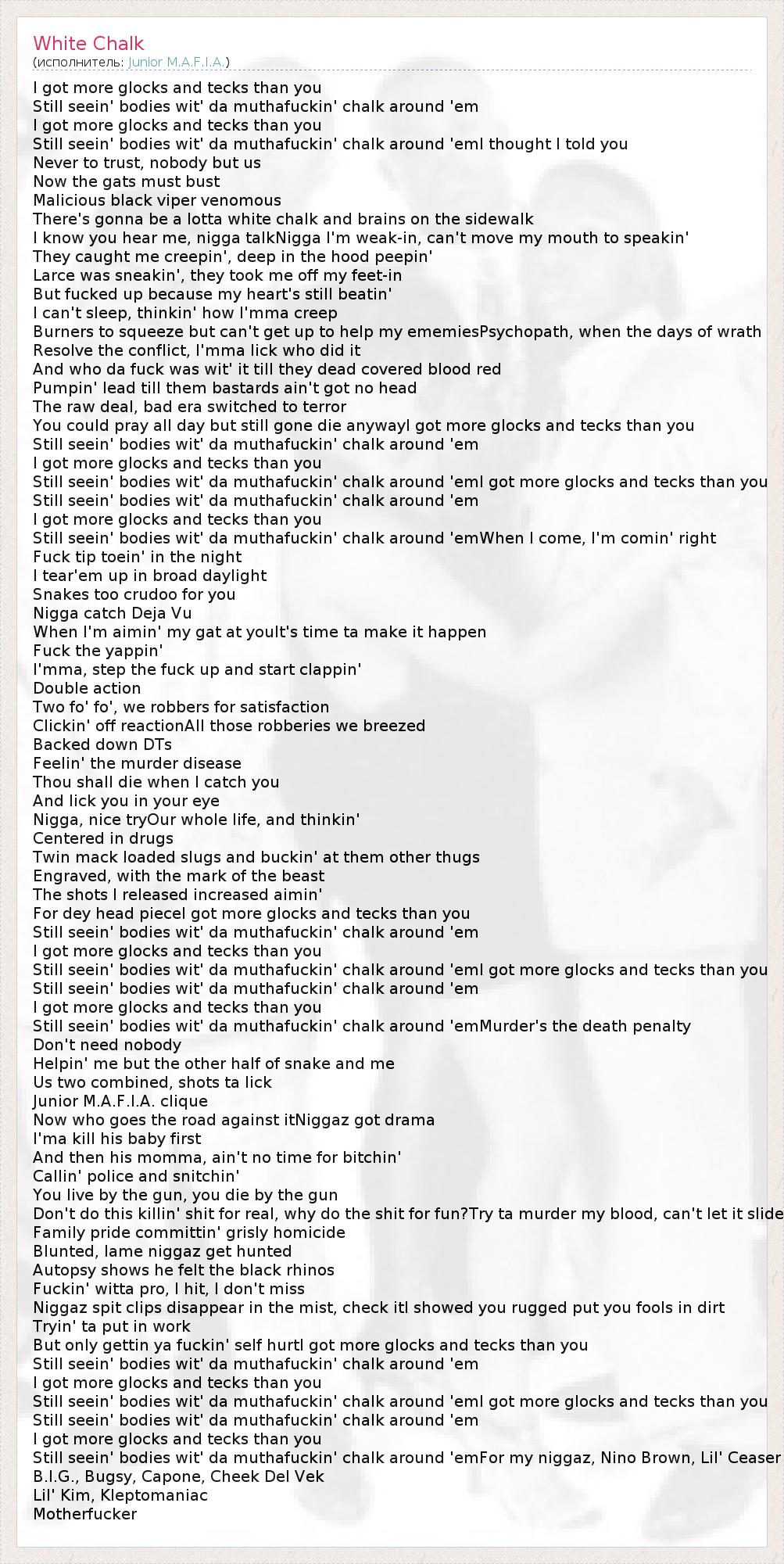 Это интересно:Junior M.A.F.I.A. (Junior Masters Аt Finding Intelligent Attitudes) - американская хип-хоп группа из Бруклина, Нью-Йорк. Группа была образована знаменитым рэппером Notorious B.I.G., в начале 90-х.Группа сформировалась, когда всем участникам не было и двадцати лет, к тому же все они были друзья детства основателя Biggie (он же Notorious B.I.G.).В состав Junior M.A.F.I.A. вошли:рэп группа "6s" - в нее входили Little Caesar, Chico, и Nino Brown;рэп... продолжение