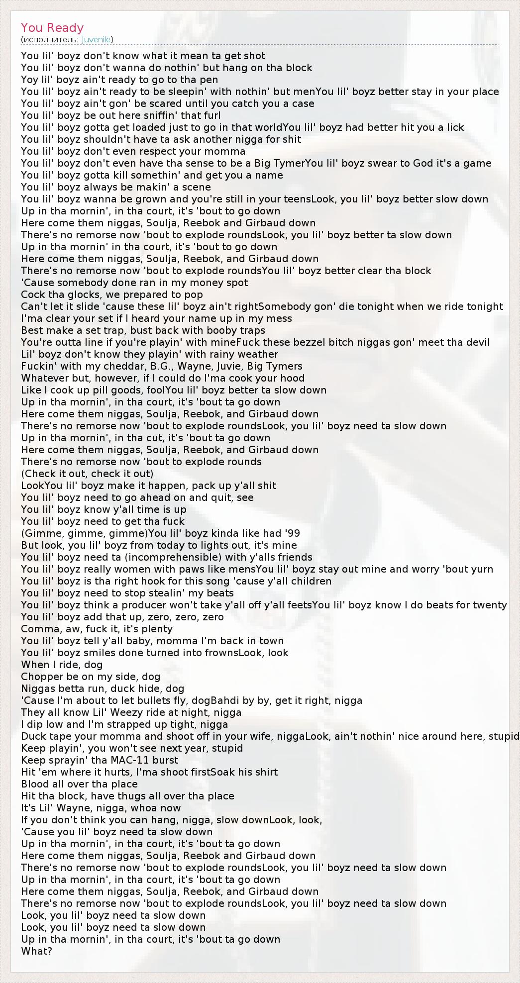 Это интересно:Только что он сверкал платиновыми зубами и грабил с подельниками банки, а теперь вы говорите мне, что Джуви сидит дома? What the fuck? Еще один уверовавший в Иисуса или Магомета? Нет? Так в чем же дело?!Ларчик открывается просто - у Juvenilе убили друга. "Я был вместе со Слимом в тот вечер, когда произошло убийство. Мы были в клубе, приятно проводили время…Я не знаю, что произошло и как это произошло,... продолжение