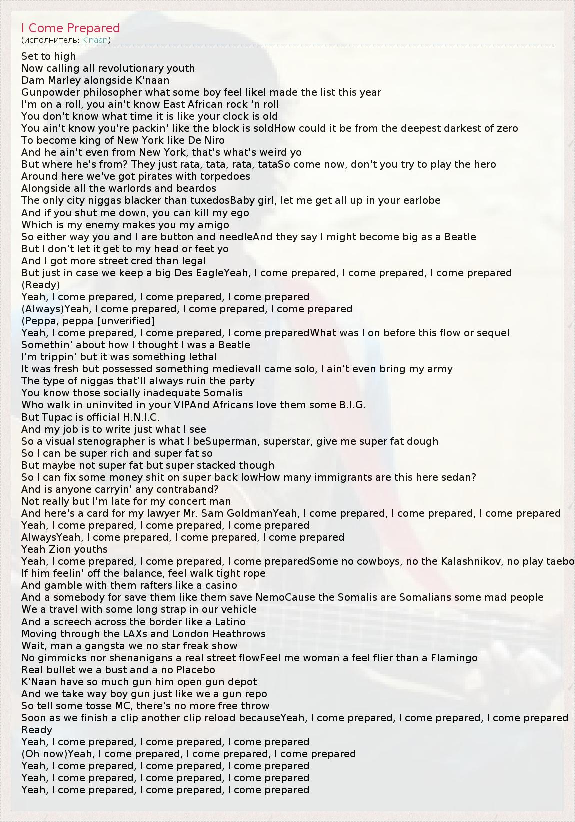 А как ты думаешь, о чем песня "I Come Prepared" ?