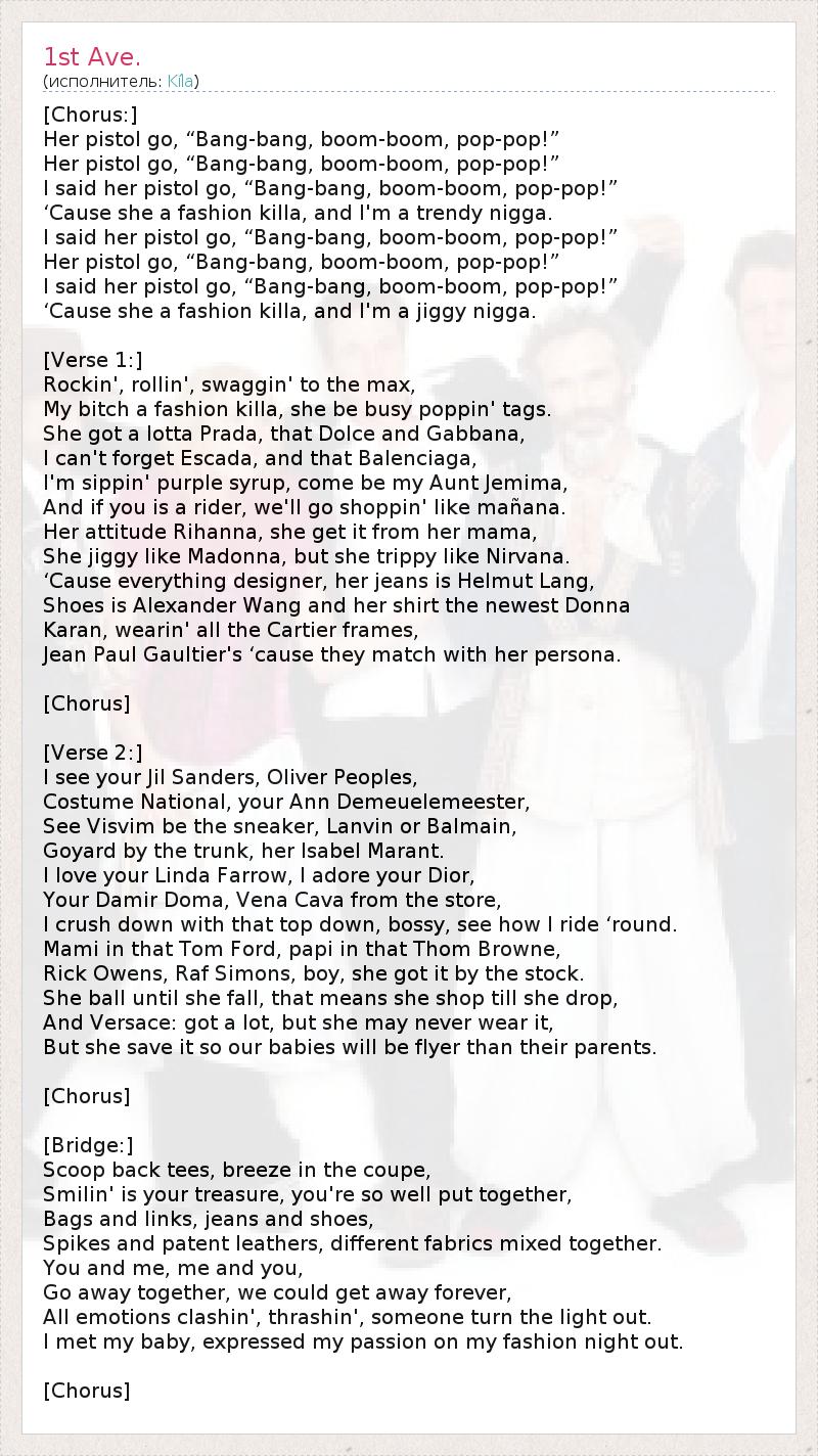 [Chorus:] Her pistol go, “Bang-bang, boom-boom, pop-pop!” Her pistol go, “Bang-bang, boom-boom, pop-pop!” I said her pistol go, “Bang-bang, boom-boom, pop-pop!” ‘Cause she a fashion killa, and I'm a trendy nigga. I said her pistol go, “Bang-bang, boom-boom, pop-pop!” Her pistol go, “Bang-bang, boom-boom, pop-pop!” I said her pistol go, “Bang-bang, boom-boom, pop-pop!” ‘Cause she a fashion killa, and I'm a jiggy nigga. [Verse 1:] Rockin', rollin', swaggin' to the max, My bitch a fashion killa, she be busy poppin' tags. She got a lotta Prada, that Dolce and Gabbana, I can't forget Escada, and that Balenciaga, I'm sippin' purple syrup, come be my Aunt Jemima, And if you is a rider, we'll go shoppin' like mañana. Her attitude Rihanna, she get it from her mama, She jiggy like Madonna, but she trippy like Nirvana. ‘Cause everything designer, her jeans is Helmut Lang, Shoes is Alexander Wang and her shirt the newest Donna Karan, wearin' all the Cartier frames, Jean Paul Gaultier's ‘cause they match with her persona. [Chorus] [Verse 2:] I see your Jil Sanders, Oliver Peoples, Costume National, your Ann Demeuelemeester, See Visvim be the sneaker, Lanvin or Balmain, Goyard by the trunk, her Isabel Marant. I love your Linda Farrow, I adore your Dior, Your Damir Doma, Vena Cava from the store, I crush down with that top down, bossy, see how I ride ‘round. Mami in that Tom Ford, papi in that Thom Browne, Rick Owens, Raf Simons, boy, she got it by the stock. She ball until she fall, that means she shop till she drop, And Versace: got a lot, but she may never wear it, But she save it so our babies will be flyer than their parents. [Chorus] [Bridge:] Scoop back tees, breeze in the coupe, Smilin' is your treasure, you're so well put together, Bags and links, jeans and shoes, Spikes and patent leathers, different fabrics mixed together. You and me, me and you, Go away together, we could get away forever, All emotions clashin', thrashin', someone turn the light out. I met my baby, expressed my passion on my fashion night out. [Chorus]