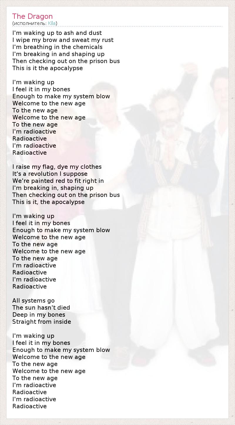 Я пробуждаюсь среди пепла и пыли, Вытираю ржавчину, что проступает пóтом. Каждый вдох полон химикатов, Я разрушаюсь и формируюсь снова, Затем расплачиваюсь и выхожу из тюремного автобуса. Вот и всё, это апокалипсис. Это пробуждение, Ощущаю его каждой частичкой тела. Этого чувства достаточно, чтобы снесло крышу. Добро пожаловать в новую эру, В новую эру! Добро пожаловать в новую эру, В новую эру! Я - радиоактивен, Радиоактивен. Я - радиоактивен, Радиоактивен. Я поднимаю свое знамя, переодеваюсь в одежду другого цвета. 1 Полагаю, что это - революция. Чтобы соответствовать ей, мы окрасились в красное. Я разрушаюсь и формируюсь снова, Затем расплачиваюсь и выхожу из тюремного автобуса. Вот и все, это апокалипсис. Это пробуждение, Ощущаю его каждой частичкой тела. Этого чувства достаточно, чтобы снесло крышу. Добро пожаловать в новую эру, В новую эру! Добро пожаловать в новую эру, В новую эру! Я - радиоактивен, Радиоактивен. Я - радиоактивен, Радиоактивен. Все системы в норме, Солнце не погасло. Оно глубоко внутри, Прямо во мне... Это пробуждение, Ощущаю его каждой частичкой тела. Этого чувства достаточно, чтобы снесло крышу. Добро пожаловать в новую эру, В новую эру! Добро пожаловать в новую эру, В новую эру! Я - радиоактивен, Радиоактивен. Я - радиоактивен, Радиоактивен. 1 - буквально: перекрашиваю свою одежду