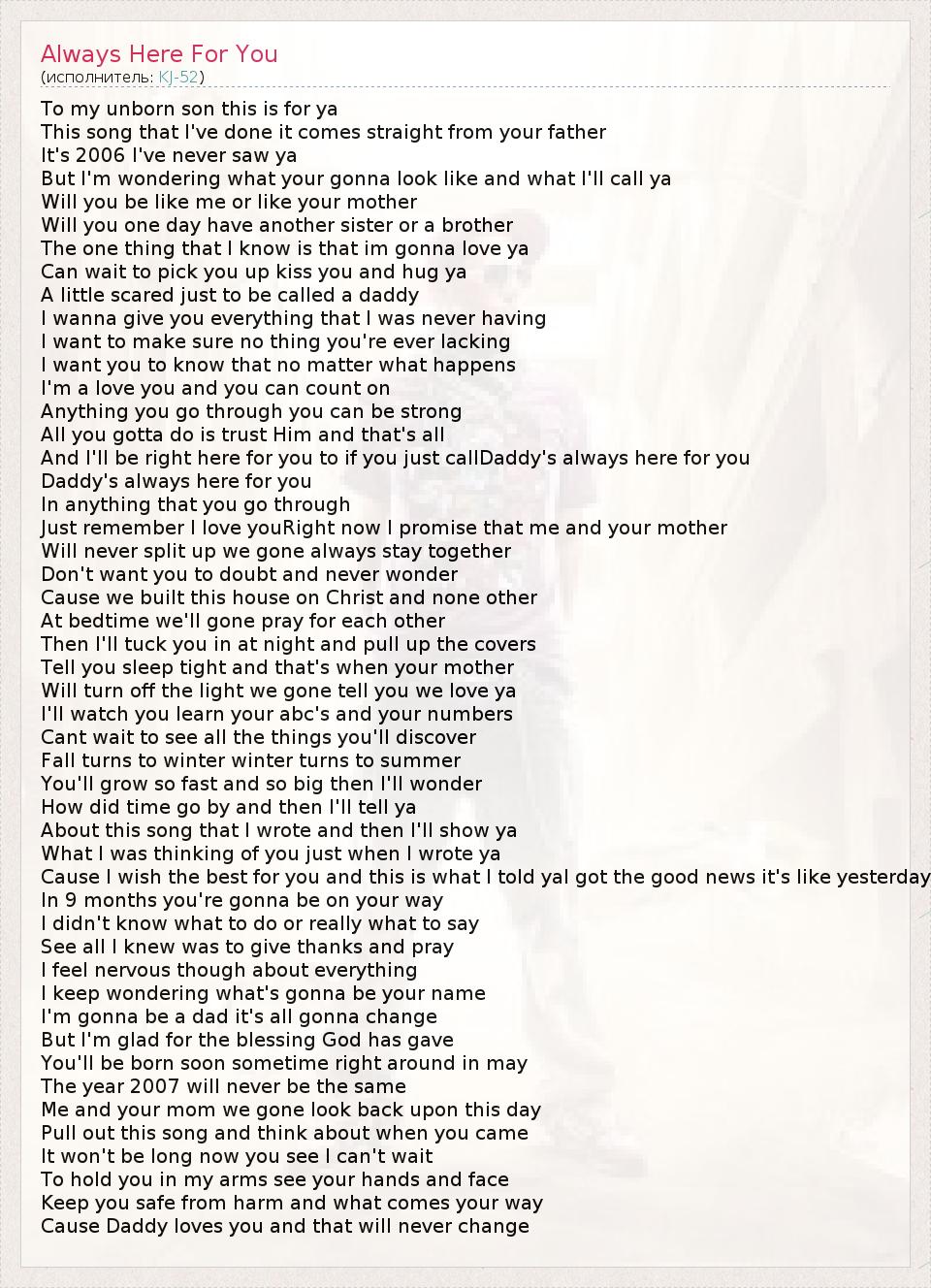 To my unborn son this is for ya This song that I've done it comes straight from your father It's 2006 I've never saw ya But I'm wondering what your gonna look like and what I'll call ya Will you be like me or like your mother Will you one day have another sister or a brother The one thing that I know is that im gonna love ya Can wait to pick you up kiss you and hug ya A little scared just to be called a daddy I wanna give you everything that I was never having I want to make sure no thing you're ever lacking I want you to know that no matter what happens I'm a love you and you can count on Anything you go through you can be strong All you gotta do is trust Him and that's all And I'll be right here for you to if you just callDaddy's always here for you Daddy's always here for you In anything that you go through Just remember I love youRight now I promise that me and your mother Will never split up we gone always stay together Don't want you to doubt and never wonder Cause we built this house on Christ and none other At bedtime we'll gone pray for each other Then I'll tuck you in at night and pull up the covers Tell you sleep tight and that's when your mother Will turn off the light we gone tell you we love ya I'll watch you learn your abc's and your numbers Cant wait to see all the things you'll discover Fall turns to winter winter turns to summer You'll grow so fast and so big then I'll wonder How did time go by and then I'll tell ya About this song that I wrote and then I'll show ya What I was thinking of you just when I wrote ya Cause I wish the best for you and this is what I told yaI got the good news it's like yesterday In 9 months you're gonna be on your way I didn't know what to do or really what to say See all I knew was to give thanks and pray I feel nervous though about everything I keep wondering what's gonna be your name I'm gonna be a dad it's all gonna change But I'm glad for the blessing God has gave You'll be born soon sometime right around in may The year 2007 will never be the same Me and your mom we gone look back upon this day Pull out this song and think about when you came It won't be long now you see I can't wait To hold you in my arms see your hands and face Keep you safe from harm and what comes your way Cause Daddy loves you and that will never change