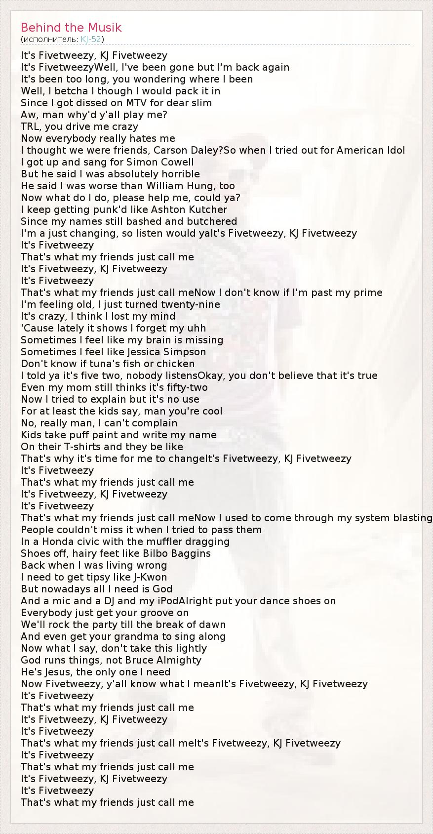 Now Fivetweezy, y'all know what I meanIt's Fivetweezy, KJ Fivetweezy