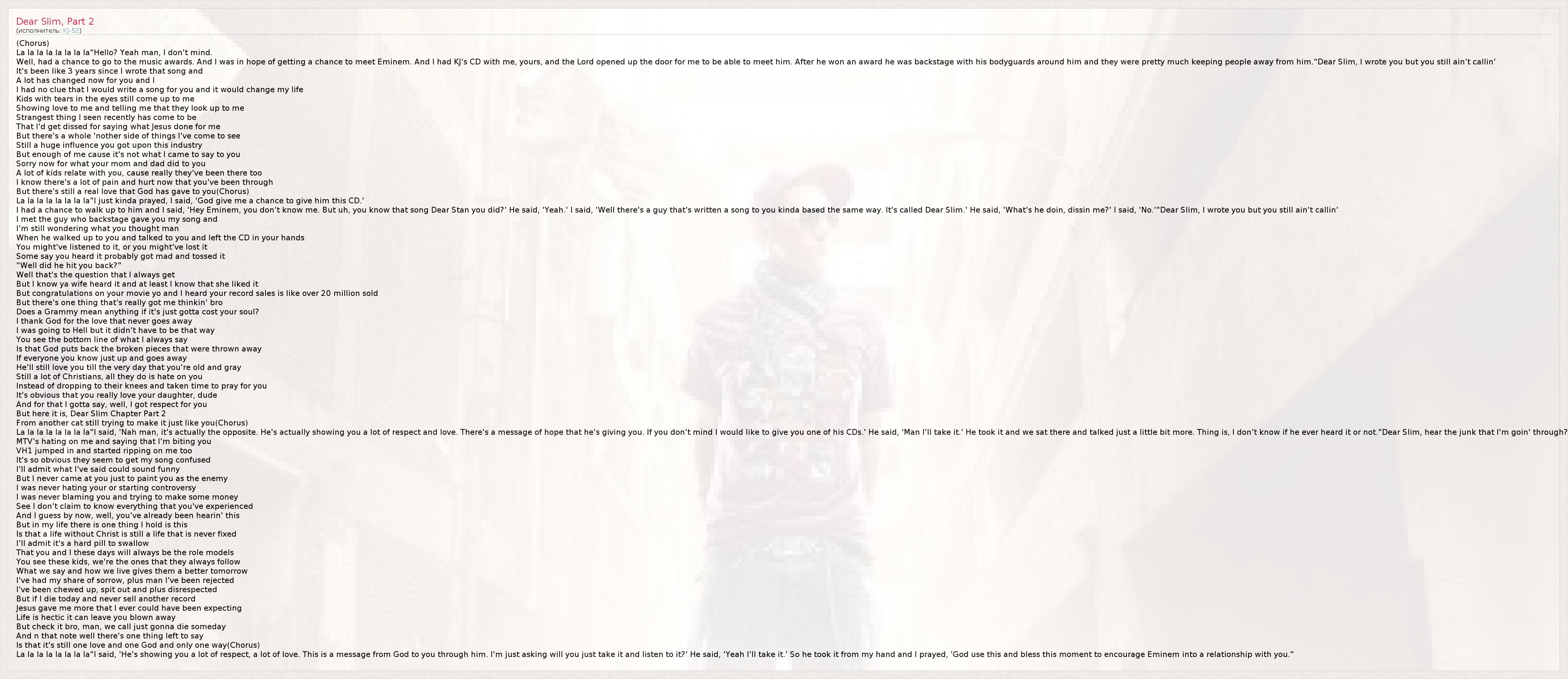 Well, had a chance to go to the music awards. And I was in hope of getting a chance to meet Eminem. And I had KJ's CD with me, yours, and the Lord opened up the door for me to be able to meet him. After he won an award he was backstage with his bodyguards around him and they were pretty much keeping people away from him."Dear Slim, I wrote you but you still ain't callin'