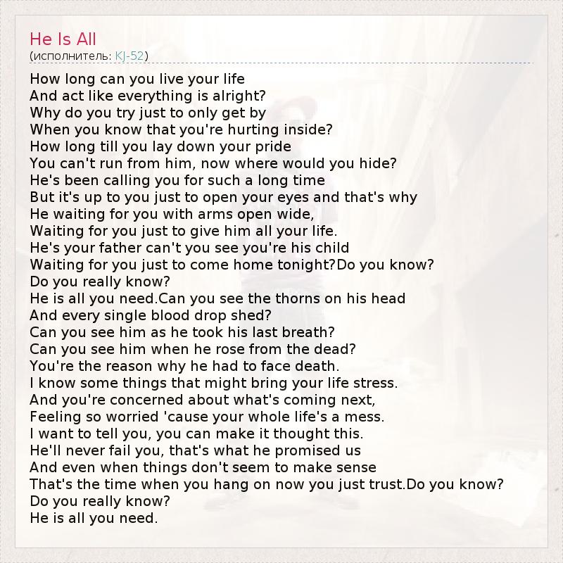 Это интересно:Настоящее имя KJ – Иона Соррентино. Иона родился 26 июня 1975 года в городе Тампа (Флорида), там и рос. Он всегда любил хип-хоп и, если можно так сказать, рос под музыку пионеров христианского хип-хопа: SFC, PID, Apocalypse, Dynamic Twins, Freedom Of Soul. Из светских групп Иона предпочитал Public Enemy и BDP. Окружавшие его сверстники в большинстве случаев уважали его за то, что он верующий, а еще всех умиляло его увлечение... продолжение