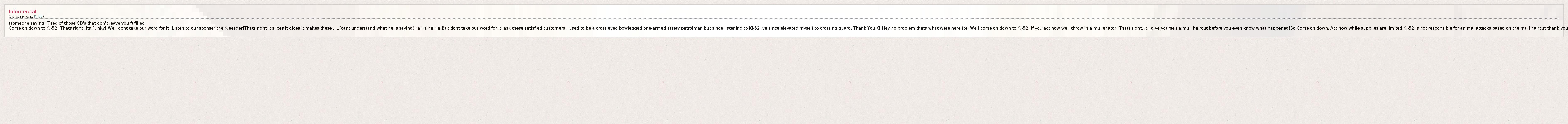 Come on down to KJ-52! Thats right! Its Funky! Well dont take our word for it! Listen to our sponser the Kleesder!Thats right it slices it dices it makes these .....(cant understand what he is saying)Ha Ha ha Ha!But dont take our word for it, ask these satisfied customers!I used to be a cross eyed bowlegged one-armed safety patrolman but since listening to KJ-52 ive since elevated myself to crossing guard. Thank You KJ!Hey no problem thats what were here for. Well come on down to KJ-52. If you act now well throw in a mullenator! Thats right, itll give yourself a mull haircut before you even know what happened!So Come on down. Act now while supplies are limited.KJ-52 is not responsible for animal attacks based on the mull haircut thank you
