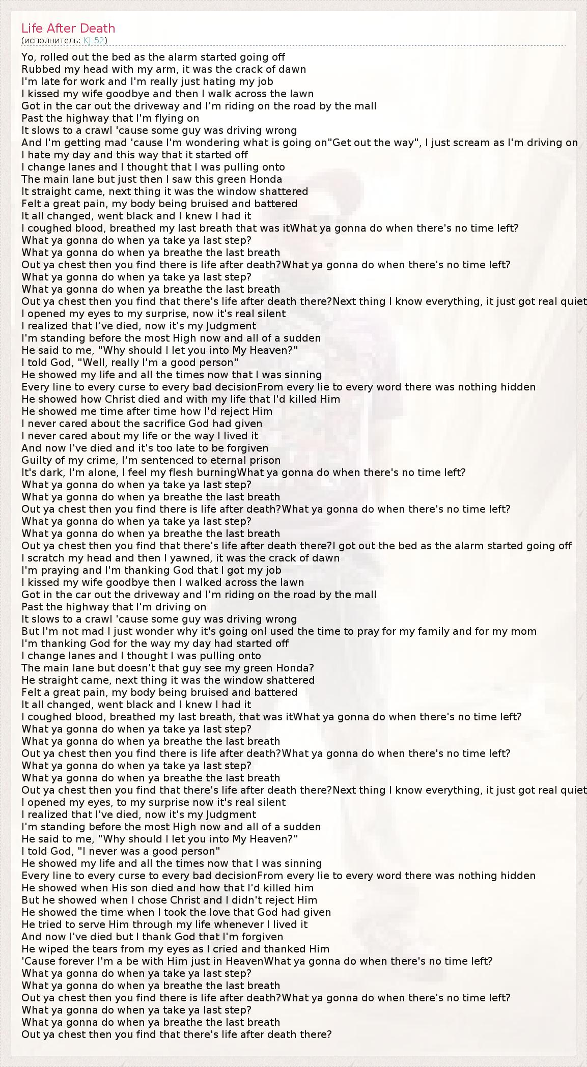 Yo, rolled out the bed as the alarm started going off Rubbed my head with my arm, it was the crack of dawn I'm late for work and I'm really just hating my job I kissed my wife goodbye and then I walk across the lawn Got in the car out the driveway and I'm riding on the road by the mall Past the highway that I'm flying on It slows to a crawl 'cause some guy was driving wrong And I'm getting mad 'cause I'm wondering what is going on"Get out the way", I just scream as I'm driving on I hate my day and this way that it started off I change lanes and I thought that I was pulling onto The main lane but just then I saw this green Honda It straight came, next thing it was the window shattered Felt a great pain, my body being bruised and battered It all changed, went black and I knew I had it I coughed blood, breathed my last breath that was itWhat ya gonna do when there's no time left? What ya gonna do when ya take ya last step? What ya gonna do when ya breathe the last breath Out ya chest then you find there is life after death?What ya gonna do when there's no time left? What ya gonna do when ya take ya last step? What ya gonna do when ya breathe the last breath Out ya chest then you find that there's life after death there?Next thing I know everything, it just got real quiet I opened my eyes to my surprise, now it's real silent I realized that I've died, now it's my Judgment I'm standing before the most High now and all of a sudden He said to me, "Why should I let you into My Heaven?" I told God, "Well, really I'm a good person" He showed my life and all the times now that I was sinning Every line to every curse to every bad decisionFrom every lie to every word there was nothing hidden He showed how Christ died and with my life that I'd killed Him He showed me time after time how I'd reject Him I never cared about the sacrifice God had given I never cared about my life or the way I lived it And now I've died and it's too late to be forgiven Guilty of my crime, I'm sentenced to eternal prison It's dark, I'm alone, I feel my flesh burningWhat ya gonna do when there's no time left? What ya gonna do when ya take ya last step? What ya gonna do when ya breathe the last breath Out ya chest then you find there is life after death?What ya gonna do when there's no time left? What ya gonna do when ya take ya last step? What ya gonna do when ya breathe the last breath Out ya chest then you find that there's life after death there?I got out the bed as the alarm started going off I scratch my head and then I yawned, it was the crack of dawn I'm praying and I'm thanking God that I got my job I kissed my wife goodbye then I walked across the lawn Got in the car out the driveway and I'm riding on the road by the mall Past the highway that I'm driving on It slows to a crawl 'cause some guy was driving wrong But I'm not mad I just wonder why it's going onI used the time to pray for my family and for my mom I'm thanking God for the way my day had started off I change lanes and I thought I was pulling onto The main lane but doesn't that guy see my green Honda? He straight came, next thing it was the window shattered Felt a great pain, my body being bruised and battered It all changed, went black and I knew I had it I coughed blood, breathed my last breath, that was itWhat ya gonna do when there's no time left? What ya gonna do when ya take ya last step? What ya gonna do when ya breathe the last breath Out ya chest then you find there is life after death?What ya gonna do when there's no time left? What ya gonna do when ya take ya last step? What ya gonna do when ya breathe the last breath Out ya chest then you find that there's life after death there?Next thing I know everything, it just got real quiet I opened my eyes, to my surprise now it's real silent I realized that I've died, now it's my Judgment I'm standing before the most High now and all of a sudden He said to me, "Why should I let you into My Heaven?" I told God, "I never was a good person" He showed my life and all the times now that I was sinning Every line to every curse to every bad decisionFrom every lie to every word there was nothing hidden He showed when His son died and how that I'd killed him But he showed when I chose Christ and I didn't reject Him He showed the time when I took the love that God had given He tried to serve Him through my life whenever I lived it And now I've died but I thank God that I'm forgiven He wiped the tears from my eyes as I cried and thanked Him 'Cause forever I'm a be with Him just in HeavenWhat ya gonna do when there's no time left? What ya gonna do when ya take ya last step? What ya gonna do when ya breathe the last breath Out ya chest then you find there is life after death?What ya gonna do when there's no time left? What ya gonna do when ya take ya last step? What ya gonna do when ya breathe the last breath Out ya chest then you find that there's life after death there?