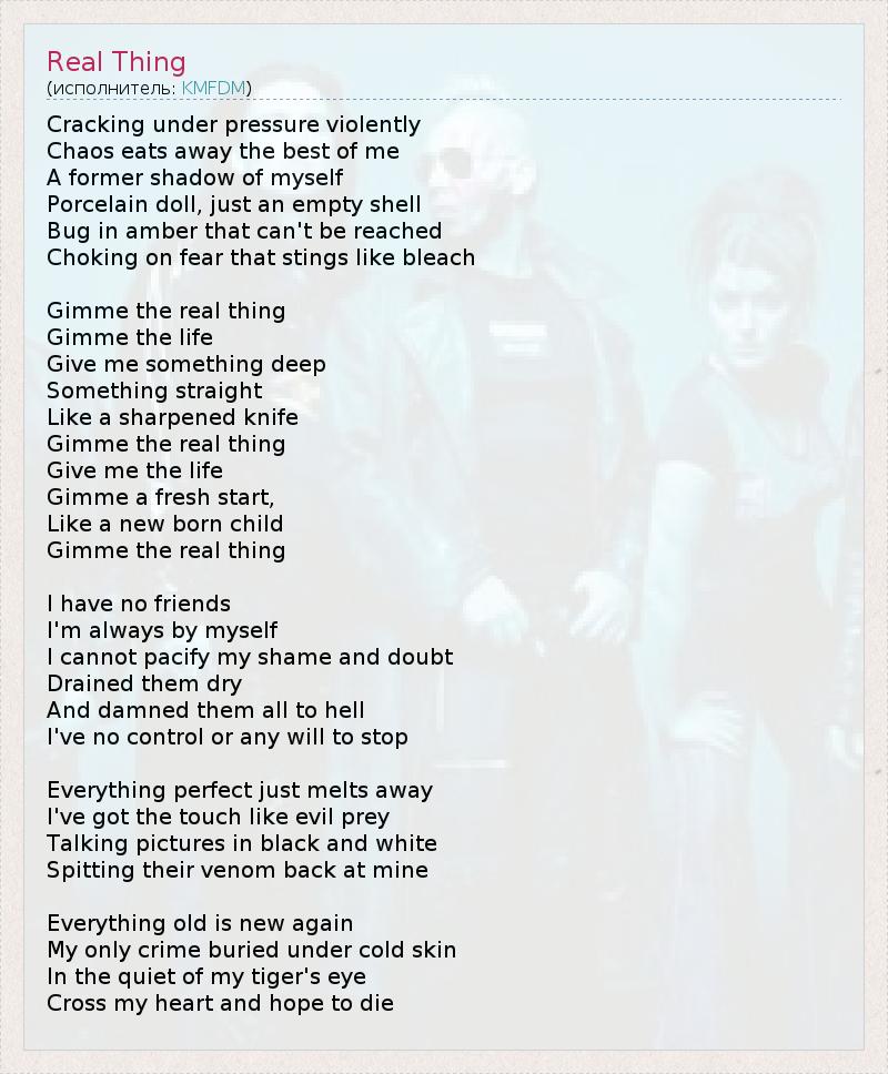 Cracking under pressure violently Chaos eats away the best of me A former shadow of myself Porcelain doll, just an empty shell Bug in amber that can't be reached Choking on fear that stings like bleach Gimme the real thing Gimme the life Give me something deep Something straight Like a sharpened knife Gimme the real thing Give me the life Gimme a fresh start, Like a new born child Gimme the real thing I have no friends I'm always by myself I cannot pacify my shame and doubt Drained them dry And damned them all to hell I've no control or any will to stop Everything perfect just melts away I've got the touch like evil prey Talking pictures in black and white Spitting their venom back at mine Everything old is new again My only crime buried under cold skin In the quiet of my tiger's eye Cross my heart and hope to die