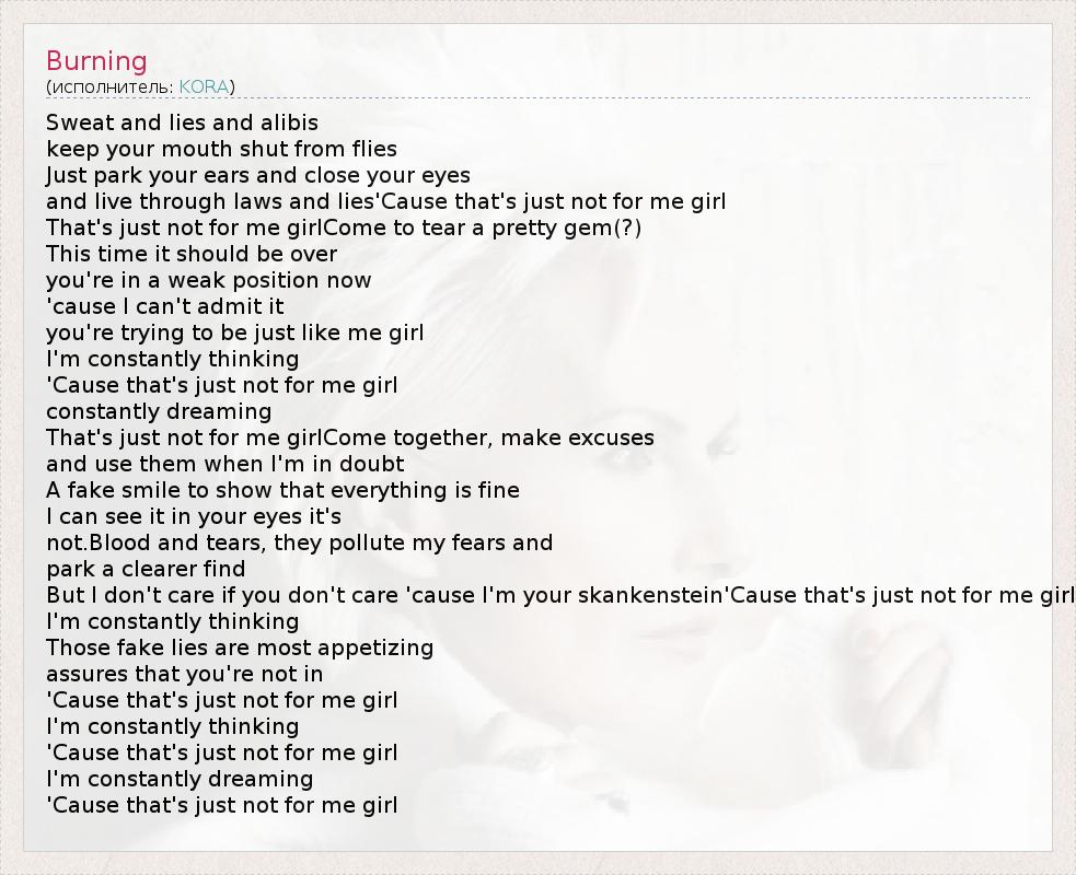 Sweat and lies and alibis keep your mouth shut from flies Just park your ears and close your eyes and live through laws and lies'Cause that's just not for me girl That's just not for me girlCome to tear a pretty gem(?) This time it should be over you're in a weak position now 'cause I can't admit it you're trying to be just like me girl I'm constantly thinking 'Cause that's just not for me girl constantly dreaming That's just not for me girlCome together, make excuses and use them when I'm in doubt A fake smile to show that everything is fine I can see it in your eyes it's not.Blood and tears, they pollute my fears and park a clearer find But I don't care if you don't care 'cause I'm your skankenstein'Cause that's just not for me girl I'm constantly thinking Those fake lies are most appetizing assures that you're not in 'Cause that's just not for me girl I'm constantly thinking 'Cause that's just not for me girl I'm constantly dreaming 'Cause that's just not for me girl
