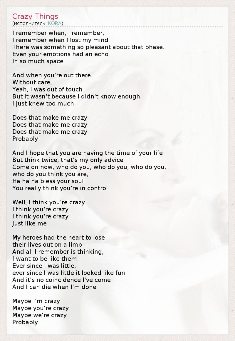 Я помню, когда… Я помню… Я помню, когда я сошёл с ума, В этом состоянии было даже что-то приятное. Даже твои эмоции отражались эхом В безграничном пространстве. Когда ты где-то там, Далеко от забот… Да, я не имел представления ни о чём, Но не потому, что я ничего не знал, А совсем наоборот, я знал слишком много… Разве это делает меня сумасшедшим? Разве это делает меня сумасшедшим? Разве это делает меня сумасшедшим? Возможно… Надеюсь, ты наслаждаешься жизнью. Но, мой совет тебе, не принимай скоропалительных решений. Ты, кого ты, кого ты, Кого ты из себя возомнил? Ха-ха-ха, Господь с тобой, Ты, правда, думаешь, что ты в своём уме! А я думаю, что ты сумасшедший. Я думаю, что ты сумасшедший. Я думаю, что ты сумасшедший, Совсем как я. Моим героям хватало смелости Рисковать жизнью и умирать. И я помню лишь то, Как хотел быть похожим на них. Впоследствии всю жизнь… Впоследствии всю жизнь мне казалось это забавным. Нет ничего случайного в том, что я пришёл в этот мир. И я умру, когда выполню своё предназначение. Возможно, я сумасшедший, Возможно, ты сумасшедший, Возможно, мы сумасшедшие… Возможно…