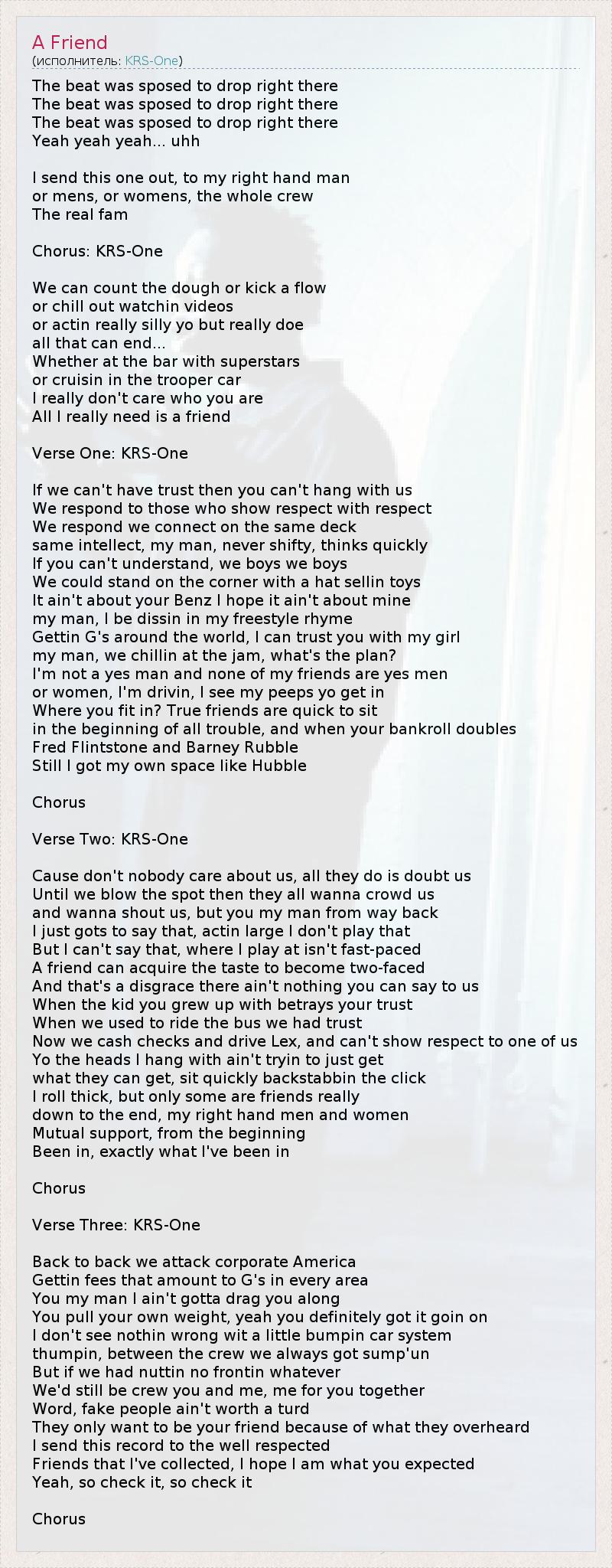 Это интересно:KRS-One (настоящее имя Lawrence Parker) говорил и говорит от имени хип-хопа в течение больше чем десятилетия. KRS-One (Knowledge Reigns Supreme Over Nearly Everyone) до сих пор является самым громким голосом философского и духовного понимания хип-хопа.Покинув дом в возрасте 14 лет, чтобы познать общую философию, мировую религию и сделать карьеру в рэп музыке, молодой Лоренс в течение пяти лет был частью бездомного населения... продолжение