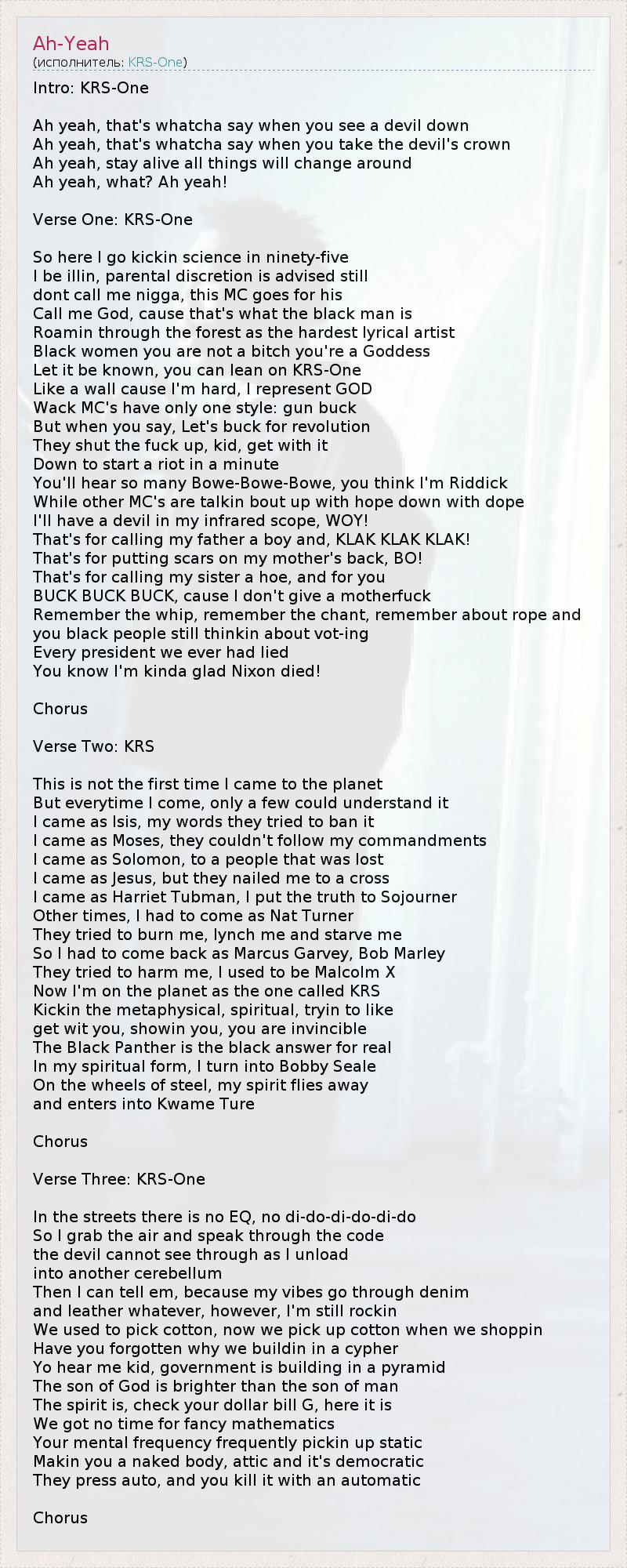 Intro: KRS-One Ah yeah, that's whatcha say when you see a devil down Ah yeah, that's whatcha say when you take the devil's crown Ah yeah, stay alive all things will change around Ah yeah, what? Ah yeah! Verse One: KRS-One So here I go kickin science in ninety-five I be illin, parental discretion is advised still dont call me nigga, this MC goes for his Call me God, cause that's what the black man is Roamin through the forest as the hardest lyrical artist Black women you are not a bitch you're a Goddess Let it be known, you can lean on KRS-One Like a wall cause I'm hard, I represent GOD Wack MC's have only one style: gun buck But when you say, Let's buck for revolution They shut the fuck up, kid, get with it Down to start a riot in a minute You'll hear so many Bowe-Bowe-Bowe, you think I'm Riddick While other MC's are talkin bout up with hope down with dope I'll have a devil in my infrared scope, WOY! That's for calling my father a boy and, KLAK KLAK KLAK! That's for putting scars on my mother's back, BO! That's for calling my sister a hoe, and for you BUCK BUCK BUCK, cause I don't give a motherfuck Remember the whip, remember the chant, remember about rope and you black people still thinkin about vot-ing Every president we ever had lied You know I'm kinda glad Nixon died! Chorus Verse Two: KRS This is not the first time I came to the planet But everytime I come, only a few could understand it I came as Isis, my words they tried to ban it I came as Moses, they couldn't follow my commandments I came as Solomon, to a people that was lost I came as Jesus, but they nailed me to a cross I came as Harriet Tubman, I put the truth to Sojourner Other times, I had to come as Nat Turner They tried to burn me, lynch me and starve me So I had to come back as Marcus Garvey, Bob Marley They tried to harm me, I used to be Malcolm X Now I'm on the planet as the one called KRS Kickin the metaphysical, spiritual, tryin to like get wit you, showin you, you are invincible The Black Panther is the black answer for real In my spiritual form, I turn into Bobby Seale On the wheels of steel, my spirit flies away and enters into Kwame Ture Chorus Verse Three: KRS-One In the streets there is no EQ, no di-do-di-do-di-do So I grab the air and speak through the code the devil cannot see through as I unload into another cerebellum Then I can tell em, because my vibes go through denim and leather whatever, however, I'm still rockin We used to pick cotton, now we pick up cotton when we shoppin Have you forgotten why we buildin in a cypher Yo hear me kid, government is building in a pyramid The son of God is brighter than the son of man The spirit is, check your dollar bill G, here it is We got no time for fancy mathematics Your mental frequency frequently pickin up static Makin you a naked body, attic and it's democratic They press auto, and you kill it with an automatic Chorus