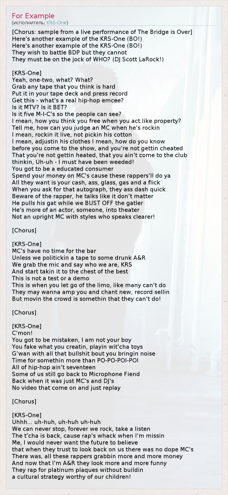 [Chorus: sample from a live performance of The Bridge is Over] Here's another example of the KRS-One (BO!) Here's another example of the KRS-One (BO!) They wish to battle BDP but they cannot They must be on the jock of WHO? (DJ Scott LaRock!) [KRS-One] Yeah, one-two, what? What? Grab any tape that you think is hard Put it in your tape deck and press record Get this - what's a real hip-hop emcee? Is it MTV? Is it BET? Is it five M-I-C's so the people can see? I mean, how you think you free when you act like property? Tell me, how can you judge an MC when he's rockin I mean, rockin it live, not pickin his cotton I mean, adjustin his clothes I mean, how do you know before you come to the show, and you're not gettin cheated That you're not gettin heated, that you ain't come to the club thinkin, Uh-uh - I must have been weeded! You got to be a educated consumer Spend your money on MC's cause these rappers'll do ya All they want is your cash, ass, glass, gas and a flick When you ask for that autograph, they ass dash quick Beware of the rapper, he talks like it don't matter He pulls his gat while we BUST OFF the gatler He's more of an actor, someone, into theater Not an upright MC with styles who speaks clearer! [Chorus] [KRS-One] MC's have no time for the bar Unless we politickin a tape to some drunk A&R We grab the mic and say who we are, KRS And start takin it to the chest of the best This is not a test or a demo This is when you let go of the limo, like many can't do They may wanna amp you and chant new, record sellin But movin the crowd is somethin that they can't do! [Chorus] [KRS-One] C'mon! You got to be mistaken, I am not your boy You fake what you creatin, playin wit'cha toys G'wan with all that bullshit bout you bringin noise Time for somethin more than PO-PO-POI-POI All of hip-hop ain't seventeen Some of us still go back to Microphone Fiend Back when it was just MC's and DJ's No video that come on and just replay [Chorus] [KRS-One] Uhhh... uh-huh, uh-huh uh-huh We can never stop, forever we rock, take a listen The t'cha is back, cause rap's whack when I'm missin Me, I would never want the future to believe that when they trust to look back on us there was no dope MC's There was, all these rappers grabbin more and more money And now that I'm A&R they look more and more funny They rap for platinum plaques without buildin a cultural strategy worthy of our children!