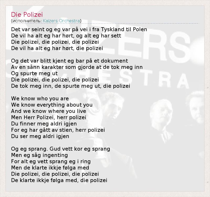 Det var seint og eg var på vei i fra Tyskland til Polen De vil ha alt eg har hørt, og alt eg har sett Die polizei, die polizei, die polizei De vil ha alt eg har hørt, die polizei Og det var blitt kjent eg bar på et dokument Av en sånn karakter som gjorde at de tok meg inn Og spurte meg ut Die polizei, die polizei, die polizei De tok meg inn, de spurte meg ut, die polizei We know who you are We know everything about you And we know where you live Men Herr Polizei, herr polizei Du finner meg aldri igjen For eg har gått av stien, herr polizei Du ser meg aldri igjen Og eg sprang. Gud vett kor eg sprang Men eg såg ingenting For alt eg vett sprang eg i ring Men de klarte ikkje følga med Die polizei, die polizei, die polizei De klarte ikkje følga med, die polizei