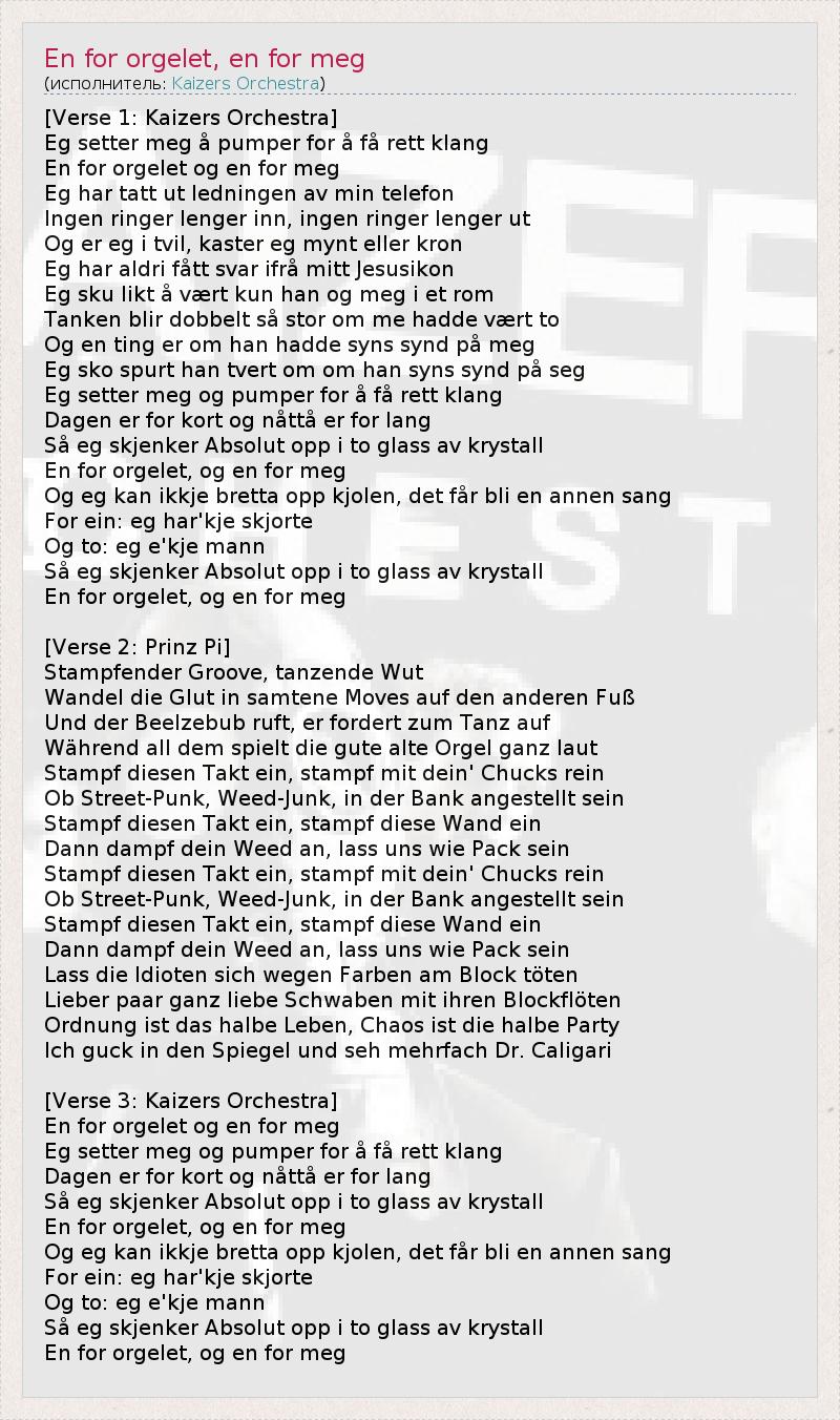 [Verse 1: Kaizers Orchestra] Eg setter meg å pumper for å få rett klang En for orgelet og en for meg Eg har tatt ut ledningen av min telefon Ingen ringer lenger inn, ingen ringer lenger ut Og er eg i tvil, kaster eg mynt eller kron Eg har aldri fått svar ifrå mitt Jesusikon Eg sku likt å vært kun han og meg i et rom Tanken blir dobbelt så stor om me hadde vært to Og en ting er om han hadde syns synd på meg Eg sko spurt han tvert om om han syns synd på seg Eg setter meg og pumper for å få rett klang Dagen er for kort og nåttå er for lang Så eg skjenker Absolut opp i to glass av krystall En for orgelet, og en for meg Og eg kan ikkje bretta opp kjolen, det får bli en annen sang For ein: eg har'kje skjorte Og to: eg e'kje mann Så eg skjenker Absolut opp i to glass av krystall En for orgelet, og en for meg [Verse 2: Prinz Pi] Stampfender Groove, tanzende Wut Wandel die Glut in samtene Moves auf den anderen Fuß Und der Beelzebub ruft, er fordert zum Tanz auf Während all dem spielt die gute alte Orgel ganz laut Stampf diesen Takt ein, stampf mit dein' Chucks rein Ob Street-Punk, Weed-Junk, in der Bank angestellt sein Stampf diesen Takt ein, stampf diese Wand ein Dann dampf dein Weed an, lass uns wie Pack sein Stampf diesen Takt ein, stampf mit dein' Chucks rein Ob Street-Punk, Weed-Junk, in der Bank angestellt sein Stampf diesen Takt ein, stampf diese Wand ein Dann dampf dein Weed an, lass uns wie Pack sein Lass die Idioten sich wegen Farben am Block töten Lieber paar ganz liebe Schwaben mit ihren Blockflöten Ordnung ist das halbe Leben, Chaos ist die halbe Party Ich guck in den Spiegel und seh mehrfach Dr. Caligari [Verse 3: Kaizers Orchestra] En for orgelet og en for meg Eg setter meg og pumper for å få rett klang Dagen er for kort og nåttå er for lang Så eg skjenker Absolut opp i to glass av krystall En for orgelet, og en for meg Og eg kan ikkje bretta opp kjolen, det får bli en annen sang For ein: eg har'kje skjorte Og to: eg e'kje mann Så eg skjenker Absolut opp i to glass av krystall En for orgelet, og en for meg