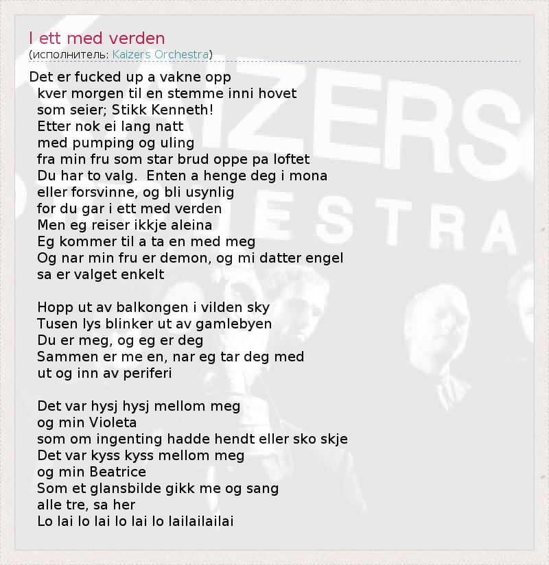 Это интересно:Kaizers Orchestra — норвежская рок-группа, образованная в 2000 году. Лидеры группы, вокалист Янове Оттесен (Janove Ottesen) и гитарист Геир Заль (Geir Zahl) были знакомы с детства и впервые играли вместе в 1991 году в группе «Blod, Snått & Juling».«Кайзеры» в первую очередь отличились тем, что стали первой норвежской группой, поющей на родном норвежском, получившей широкую известность в континентальной Европе.... продолжение