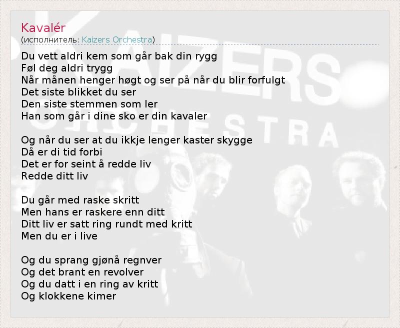 Это интересно:Kaizers Orchestra — норвежская рок-группа, образованная в 2000 году. Лидеры группы, вокалист Янове Оттесен (Janove Ottesen) и гитарист Геир Заль (Geir Zahl) были знакомы с детства и впервые играли вместе в 1991 году в группе «Blod, Snått & Juling».«Кайзеры» в первую очередь отличились тем, что стали первой норвежской группой, поющей на родном норвежском, получившей широкую известность в континентальной Европе.... продолжение