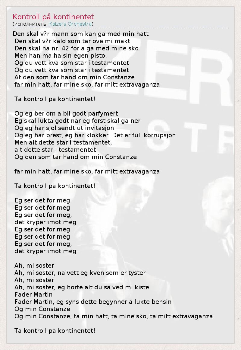 Den skal v?r mann som kan ga med min hatt Den skal v?r kald som tar ove mi makt Den skal ha nr. 42 for a ga med mine sko Men han ma ha sin egen pistol Og du vett kva som star i testamentet Og du vett kva som star i testamentet At den som tar hand om min Constanze far min hatt, far mine sko, far mitt extravaganza Ta kontroll pa kontinentet! Og eg ber om a bli godt parfymert Eg skal lukta godt nar eg forst skal ga ner Og eg har sjol sendt ut invitasjon Og eg har prest, eg har klokker. Det er full korrupsjon Men alt dette star i testamentet, alt dette star i testamentet Og den som tar hand om min Constanze far min hatt, far mine sko, far mitt extravaganza Ta kontroll pa kontinentet! Eg ser det for meg Eg ser det for meg Eg ser det for meg, det kryper imot meg Eg ser det for meg Eg ser det for meg Eg ser det for meg, det kryper imot meg Ah, mi soster Ah, mi soster, na vett eg kven som er tyster Ah, mi soster Ah, mi soster, eg horte alt du sa ved mi kiste Fader Martin Fader Martin, eg syns dette begynner a lukte bensin Og min Constanze Og min Constanze, ta min hatt, ta mine sko, ta mitt extravaganza Ta kontroll pa kontinentet!