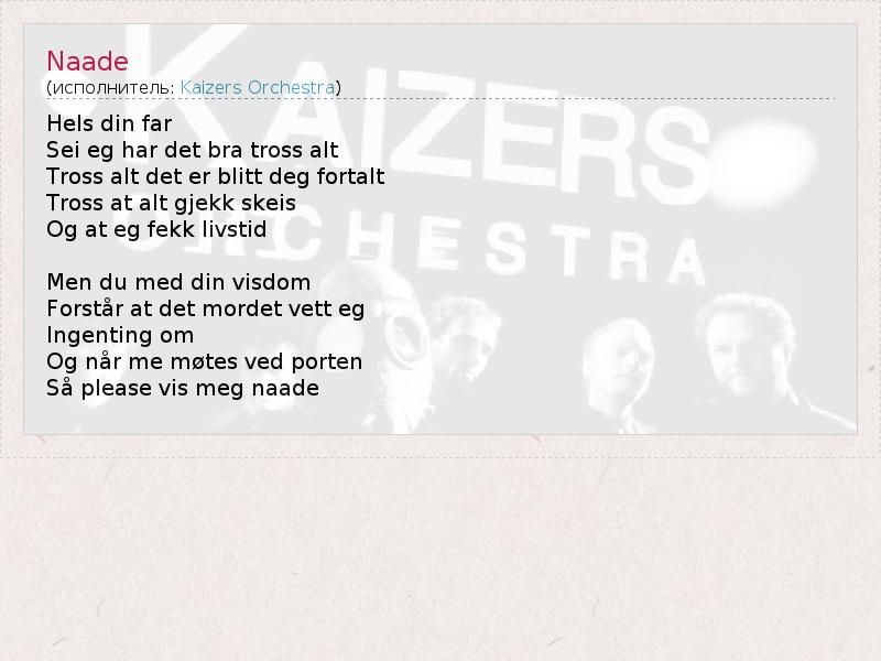 Это интересно:Kaizers Orchestra — норвежская рок-группа, образованная в 2000 году. Лидеры группы, вокалист Янове Оттесен (Janove Ottesen) и гитарист Геир Заль (Geir Zahl) были знакомы с детства и впервые играли вместе в 1991 году в группе «Blod, Snått & Juling».«Кайзеры» в первую очередь отличились тем, что стали первой норвежской группой, поющей на родном норвежском, получившей широкую известность в континентальной Европе.... продолжение