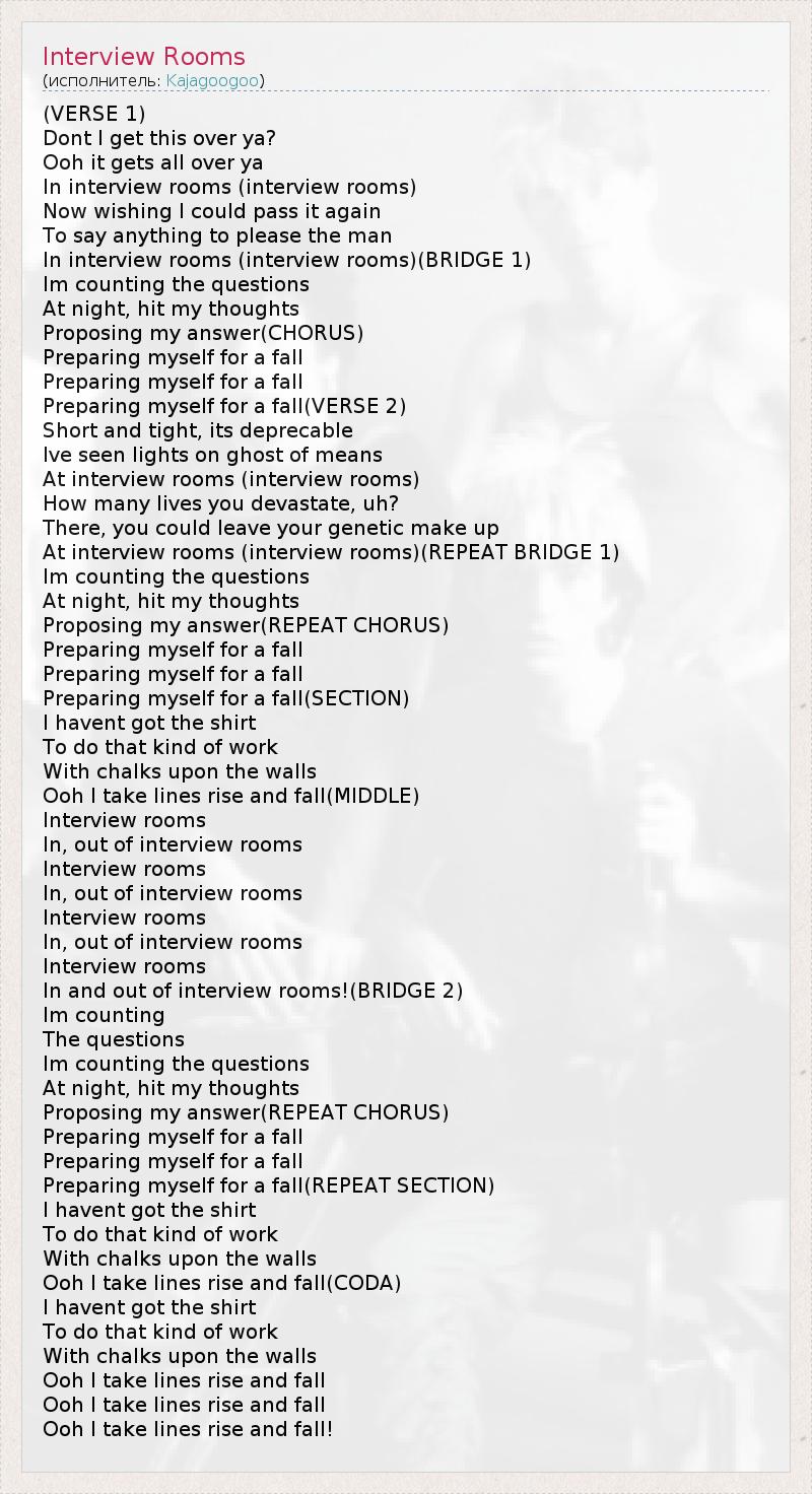 (VERSE 1) Dont I get this over ya? Ooh it gets all over ya In interview rooms (interview rooms) Now wishing I could pass it again To say anything to please the man In interview rooms (interview rooms)(BRIDGE 1) Im counting the questions At night, hit my thoughts Proposing my answer(CHORUS) Preparing myself for a fall Preparing myself for a fall Preparing myself for a fall(VERSE 2) Short and tight, its deprecable Ive seen lights on ghost of means At interview rooms (interview rooms) How many lives you devastate, uh? There, you could leave your genetic make up At interview rooms (interview rooms)(REPEAT BRIDGE 1) Im counting the questions At night, hit my thoughts Proposing my answer(REPEAT CHORUS) Preparing myself for a fall Preparing myself for a fall Preparing myself for a fall(SECTION) I havent got the shirt To do that kind of work With chalks upon the walls Ooh I take lines rise and fall(MIDDLE) Interview rooms In, out of interview rooms Interview rooms In, out of interview rooms Interview rooms In, out of interview rooms Interview rooms In and out of interview rooms!(BRIDGE 2) Im counting The questions Im counting the questions At night, hit my thoughts Proposing my answer(REPEAT CHORUS) Preparing myself for a fall Preparing myself for a fall Preparing myself for a fall(REPEAT SECTION) I havent got the shirt To do that kind of work With chalks upon the walls Ooh I take lines rise and fall(CODA) I havent got the shirt To do that kind of work With chalks upon the walls Ooh I take lines rise and fall Ooh I take lines rise and fall Ooh I take lines rise and fall!