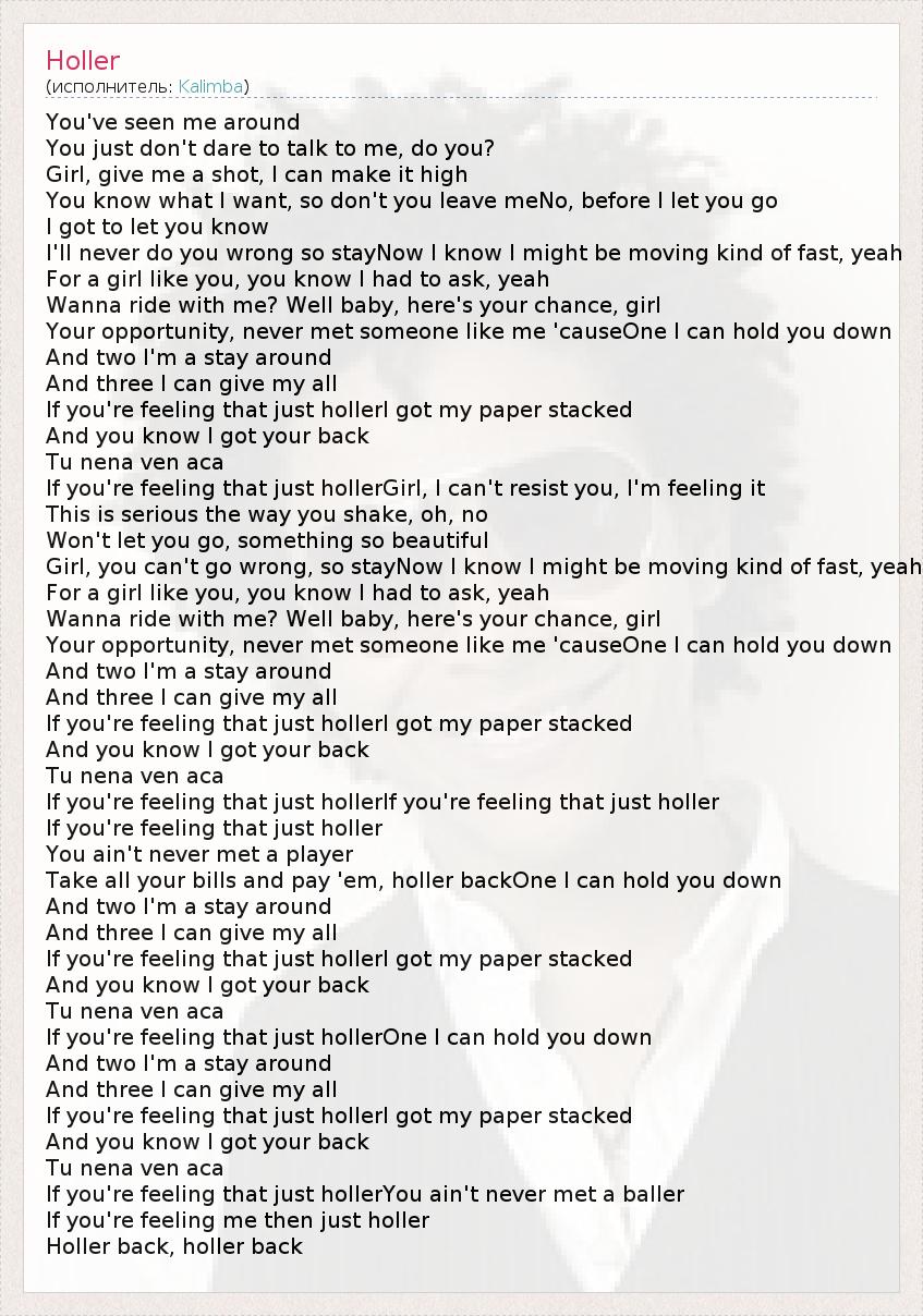 You've seen me around You just don't dare to talk to me, do you? Girl, give me a shot, I can make it high You know what I want, so don't you leave meNo, before I let you go I got to let you know I'll never do you wrong so stayNow I know I might be moving kind of fast, yeah For a girl like you, you know I had to ask, yeah Wanna ride with me? Well baby, here's your chance, girl Your opportunity, never met someone like me 'causeOne I can hold you down And two I'm a stay around And three I can give my all If you're feeling that just hollerI got my paper stacked And you know I got your back Tu nena ven aca If you're feeling that just hollerGirl, I can't resist you, I'm feeling it This is serious the way you shake, oh, no Won't let you go, something so beautiful Girl, you can't go wrong, so stayNow I know I might be moving kind of fast, yeah For a girl like you, you know I had to ask, yeah Wanna ride with me? Well baby, here's your chance, girl Your opportunity, never met someone like me 'causeOne I can hold you down And two I'm a stay around And three I can give my all If you're feeling that just hollerI got my paper stacked And you know I got your back Tu nena ven aca If you're feeling that just hollerIf you're feeling that just holler If you're feeling that just holler You ain't never met a player Take all your bills and pay 'em, holler backOne I can hold you down And two I'm a stay around And three I can give my all If you're feeling that just hollerI got my paper stacked And you know I got your back Tu nena ven aca If you're feeling that just hollerOne I can hold you down And two I'm a stay around And three I can give my all If you're feeling that just hollerI got my paper stacked And you know I got your back Tu nena ven aca If you're feeling that just hollerYou ain't never met a baller If you're feeling me then just holler Holler back, holler back