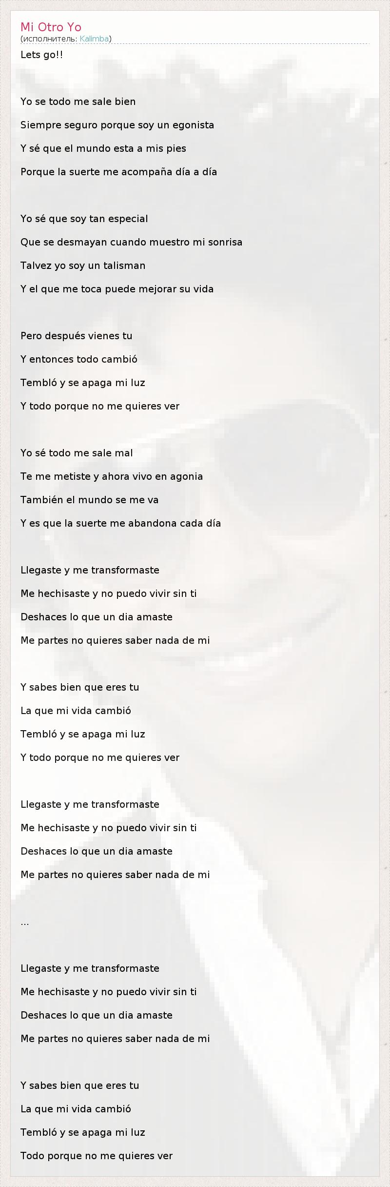 Lets go!! Yo se todo me sale bien Siempre seguro porque soy un egonista Y sé que el mundo esta a mis pies Porque la suerte me acompaña día a día Yo sé que soy tan especial Que se desmayan cuando muestro mi sonrisa Talvez yo soy un talisman Y el que me toca puede mejorar su vida Pero después vienes tu Y entonces todo cambió Tembló y se apaga mi luz Y todo porque no me quieres ver Yo sé todo me sale mal Te me metiste y ahora vivo en agonia También el mundo se me va Y es que la suerte me abandona cada día Llegaste y me transformaste Me hechisaste y no puedo vivir sin ti Deshaces lo que un dia amaste Me partes no quieres saber nada de mi Y sabes bien que eres tu La que mi vida cambió Tembló y se apaga mi luz Y todo porque no me quieres ver Llegaste y me transformaste Me hechisaste y no puedo vivir sin ti Deshaces lo que un dia amaste Me partes no quieres saber nada de mi ... Llegaste y me transformaste Me hechisaste y no puedo vivir sin ti Deshaces lo que un dia amaste Me partes no quieres saber nada de mi Y sabes bien que eres tu La que mi vida cambió Tembló y se apaga mi luz Todo porque no me quieres ver