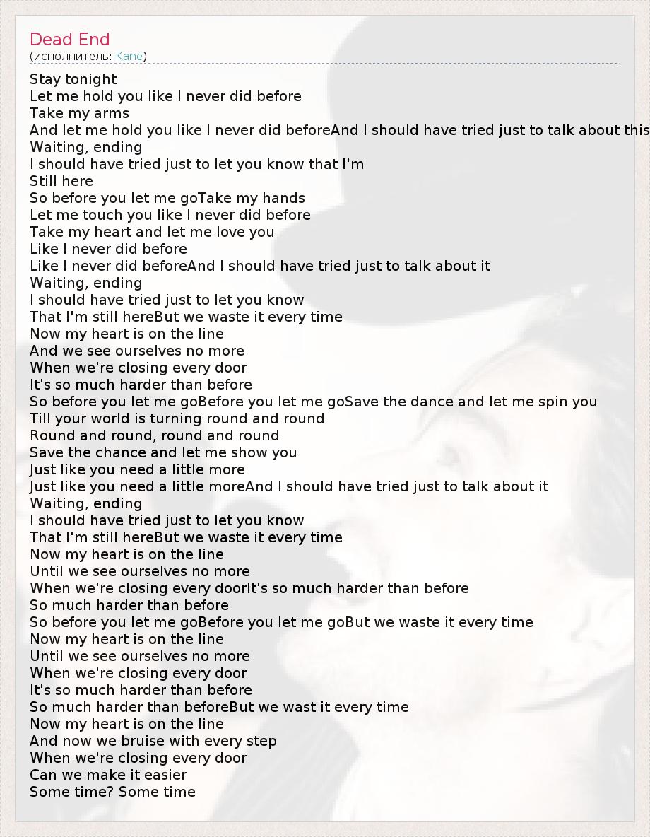 And let me hold you like I never did beforeAnd I should have tried just to talk about this