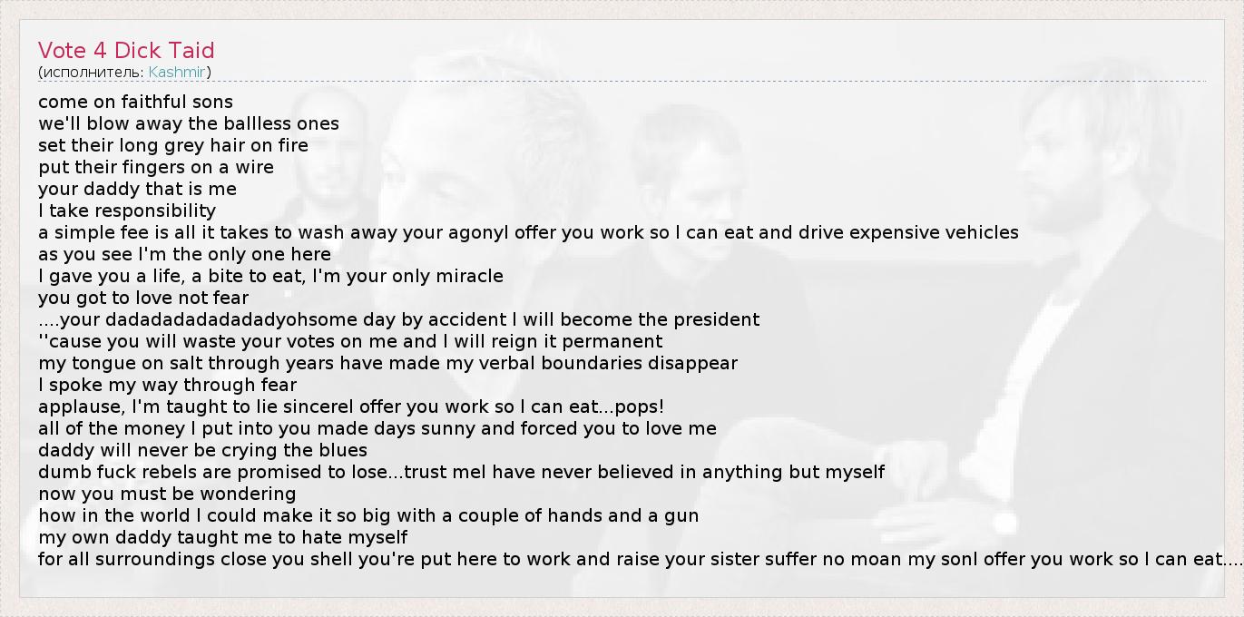 А как ты думаешь, о чем песня "Vote 4 Dick Taid" ?