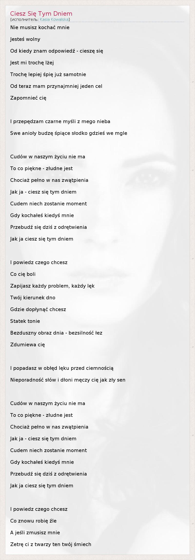 Nie musisz kochać mnie Jesteś wolny Od kiedy znam odpowiedź - cieszę się Jest mi trochę lżej Trochę lepiej śpię już samotnie Od teraz mam przynajmniej jeden cel Zapomnieć cię I przepędzam czarne myśli z mego nieba Swe anioły budzę śpiące słodko gdzieś we mgle Cudów w naszym życiu nie ma To co piękne - złudne jest Chociaż pełno w nas zwątpienia Jak ja - ciesz się tym dniem Cudem niech zostanie moment Gdy kochałeś kiedyś mnie Przebudź się dziś z odrętwienia Jak ja ciesz się tym dniem I powiedz czego chcesz Co cię boli Zapijasz każdy problem, każdy lęk Twój kierunek dno Gdzie dopłynąć chcesz Statek tonie Bezduszny obraz dnia - bezsilność łez Zdumiewa cię I popadasz w obłęd lęku przed ciemnością Nieporadność słów i dłoni męczy cię jak zły sen Cudów w naszym życiu nie ma To co piękne - złudne jest Chociaż pełno w nas zwątpienia Jak ja - ciesz się tym dniem Cudem niech zostanie moment Gdy kochałeś kiedyś mnie Przebudź się dziś z odrętwienia Jak ja ciesz się tym dniem I powiedz czego chcesz Co znowu robię źle A jeśli zmusisz mnie Zetrę ci z twarzy ten twój śmiech