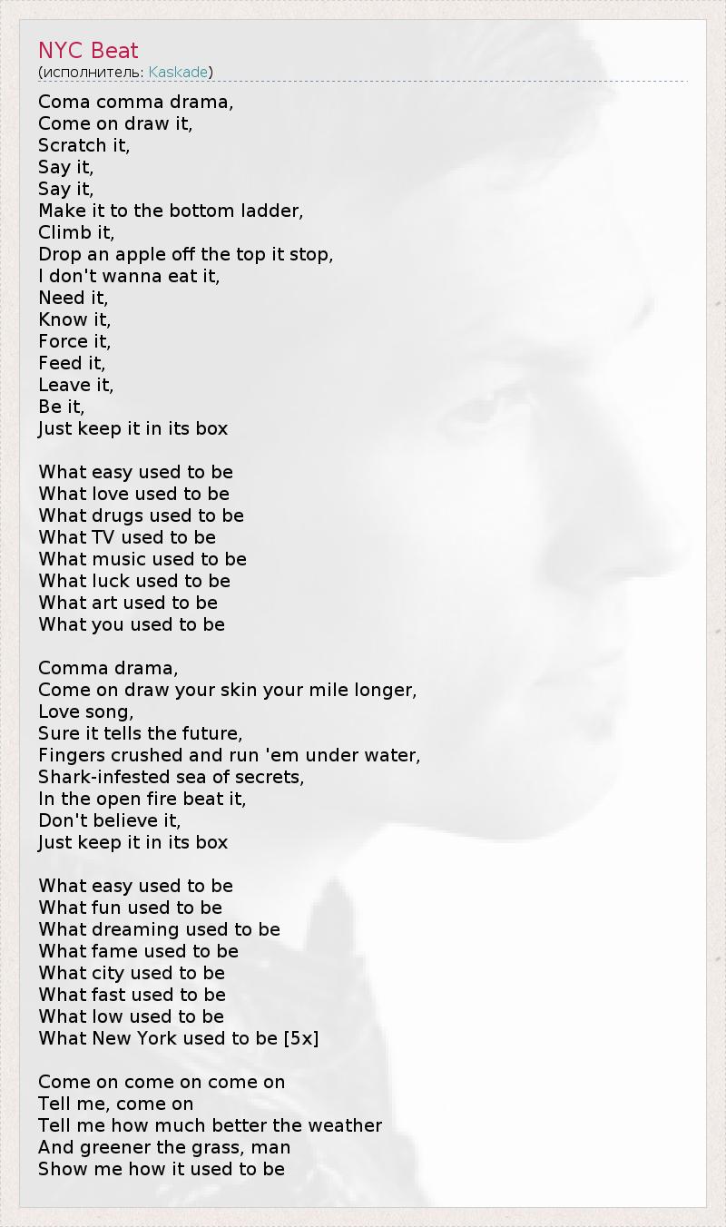 Coma comma drama, Come on draw it, Scratch it, Say it, Say it, Make it to the bottom ladder, Climb it, Drop an apple off the top it stop, I don't wanna eat it, Need it, Know it, Force it, Feed it, Leave it, Be it, Just keep it in its box What easy used to be What love used to be What drugs used to be What TV used to be What music used to be What luck used to be What art used to be What you used to be Comma drama, Come on draw your skin your mile longer, Love song, Sure it tells the future, Fingers crushed and run 'em under water, Shark-infested sea of secrets, In the open fire beat it, Don't believe it, Just keep it in its box What easy used to be What fun used to be What dreaming used to be What fame used to be What city used to be What fast used to be What low used to be What New York used to be [5x] Come on come on come on Tell me, come on Tell me how much better the weather And greener the grass, man Show me how it used to be