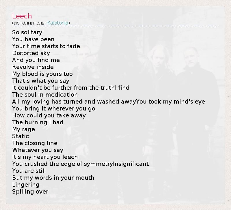 So solitary You have been Your time starts to fade Distorted sky And you find me Revolve inside My blood is yours too That's what you say It couldn't be further from the truthI find The soul in medication All my loving has turned and washed awayYou took my mind's eye You bring it wherever you go How could you take away The burning I had My rage Static The closing line Whatever you say It's my heart you leech You crushed the edge of symmetryInsignificant You are still But my words in your mouth Lingering Spilling over