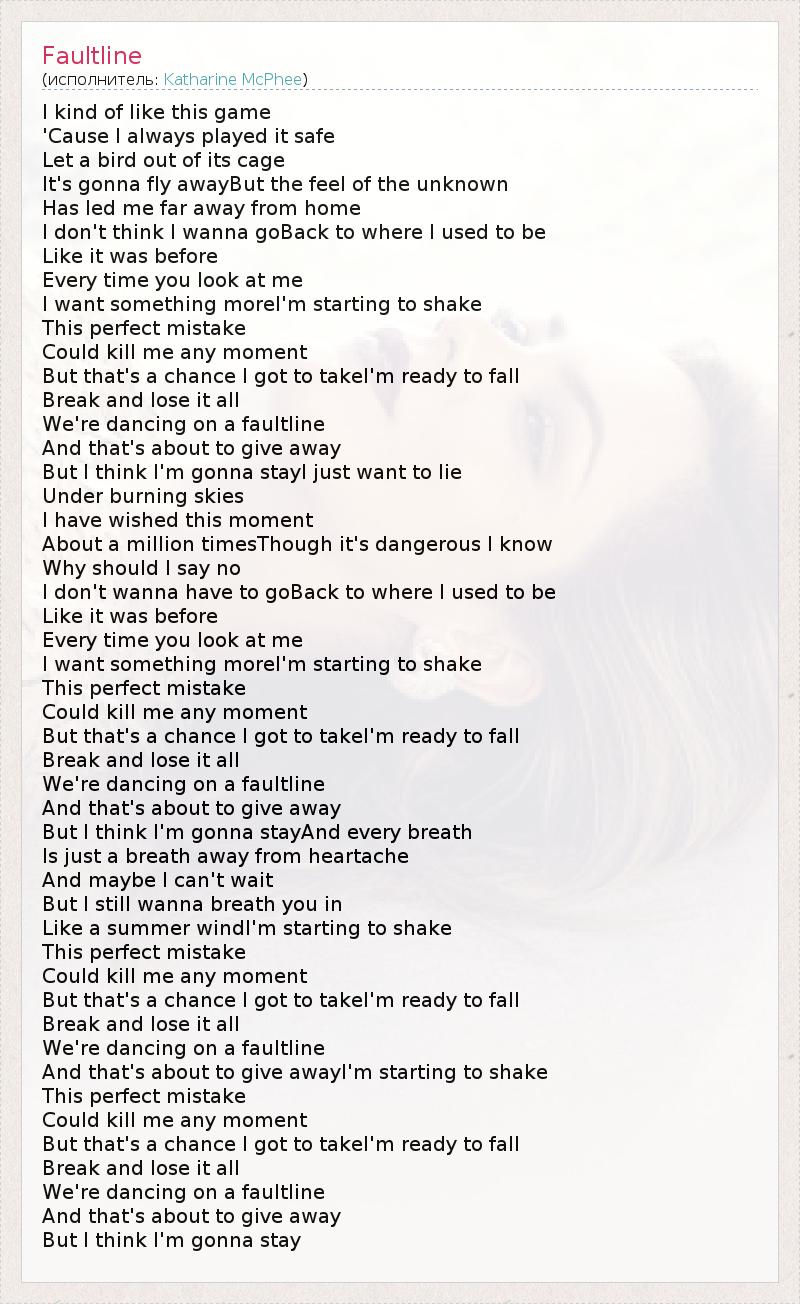 I kind of like this game 'Cause I always played it safe Let a bird out of its cage It's gonna fly awayBut the feel of the unknown Has led me far away from home I don't think I wanna goBack to where I used to be Like it was before Every time you look at me I want something moreI'm starting to shake This perfect mistake Could kill me any moment But that's a chance I got to takeI'm ready to fall Break and lose it all We're dancing on a faultline And that's about to give away But I think I'm gonna stayI just want to lie Under burning skies I have wished this moment About a million timesThough it's dangerous I know Why should I say no I don't wanna have to goBack to where I used to be Like it was before Every time you look at me I want something moreI'm starting to shake This perfect mistake Could kill me any moment But that's a chance I got to takeI'm ready to fall Break and lose it all We're dancing on a faultline And that's about to give away But I think I'm gonna stayAnd every breath Is just a breath away from heartache And maybe I can't wait But I still wanna breath you in Like a summer windI'm starting to shake This perfect mistake Could kill me any moment But that's a chance I got to takeI'm ready to fall Break and lose it all We're dancing on a faultline And that's about to give awayI'm starting to shake This perfect mistake Could kill me any moment But that's a chance I got to takeI'm ready to fall Break and lose it all We're dancing on a faultline And that's about to give away But I think I'm gonna stay
