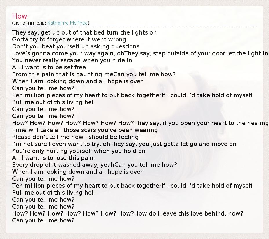 They say, get up out of that bed turn the lights on Gotta try to forget where it went wrong Don't you beat yourself up asking questions Love's gonna come your way again, ohThey say, step outside of your door let the light in You never really escape when you hide in All I want is to be set free From this pain that is haunting meCan you tell me how? When I am looking down and all hope is over Can you tell me how? Ten million pieces of my heart to put back togetherIf I could I'd take hold of myself Pull me out of this living hell Can you tell me how? Can you tell me how? How? How? How? How? How? How? How?They say, if you open your heart to the healing Time will take all those scars you've been wearing Please don't tell me how I should be feeling I'm not sure I even want to try, ohThey say, you just gotta let go and move on You're only hurting yourself when you hold on All I want is to lose this pain Every drop of it washed away, yeahCan you tell me how? When I am looking down and all hope is over Can you tell me how? Ten million pieces of my heart to put back togetherIf I could I'd take hold of myself Pull me out of this living hell Can you tell me how? Can you tell me how? How? How? How? How? How? How? How?How do I leave this love behind, how? Can you tell me how?