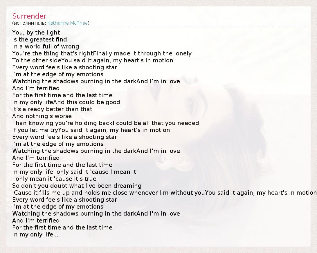 You, by the light Is the greatest find In a world full of wrong You're the thing that's rightFinally made it through the lonely To the other sideYou said it again, my heart's in motion Every word feels like a shooting star I'm at the edge of my emotions Watching the shadows burning in the darkAnd I'm in love And I'm terrified For the first time and the last time In my only lifeAnd this could be good It's already better than that And nothing's worse Than knowing you're holding backI could be all that you needed If you let me tryYou said it again, my heart's in motion Every word feels like a shooting star I'm at the edge of my emotions Watching the shadows burning in the darkAnd I'm in love And I'm terrified For the first time and the last time In my only lifeI only said it 'cause I mean it I only mean it 'cause it's true So don't you doubt what I've been dreaming 'Cause it fills me up and holds me close whenever I'm without youYou said it again, my heart's in motion Every word feels like a shooting star I'm at the edge of my emotions Watching the shadows burning in the darkAnd I'm in love And I'm terrified For the first time and the last time In my only life...