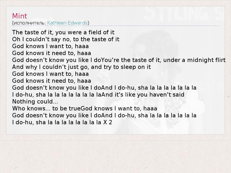 God doesn't know you like I doYou're the taste of it, under a midnight flirt