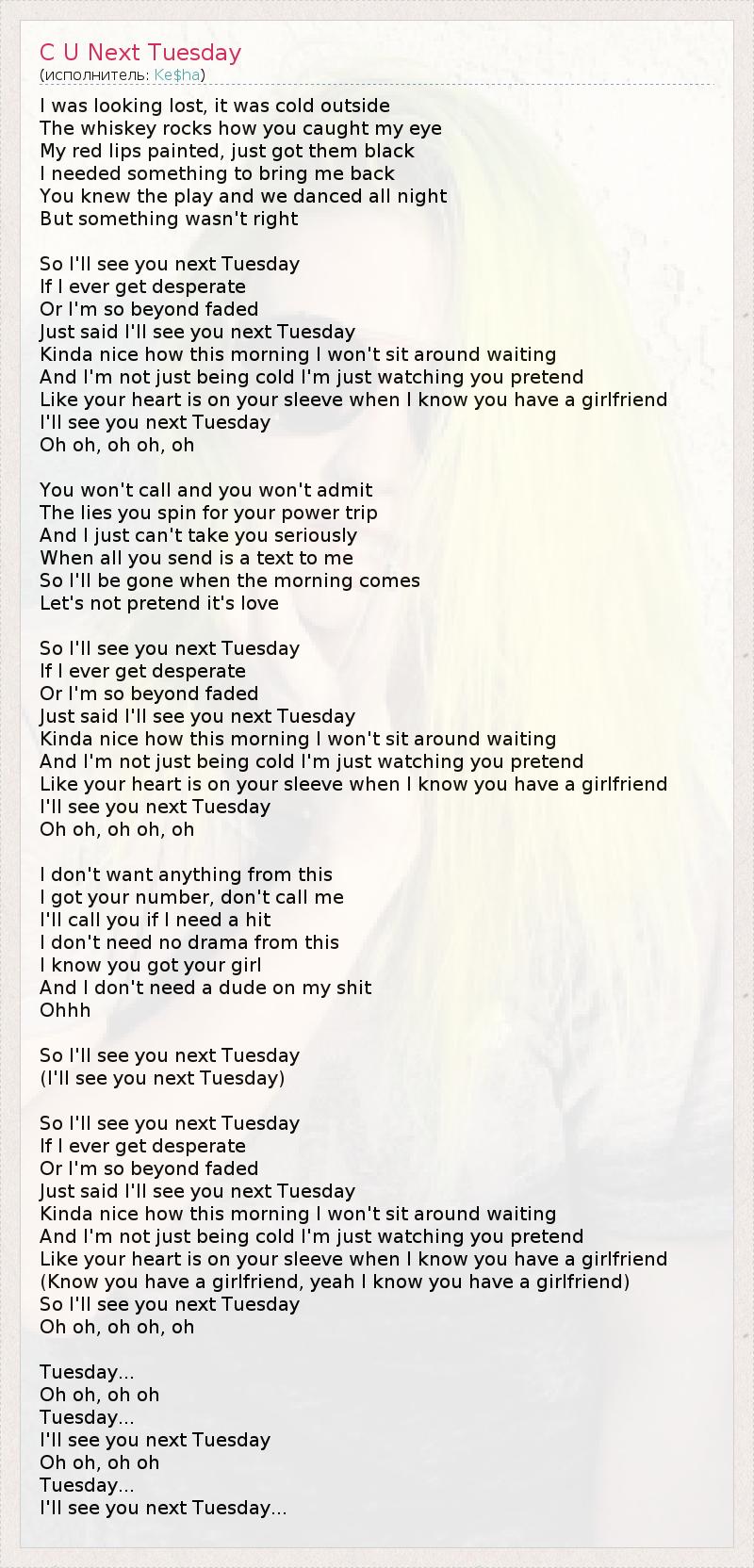 Я выглядела потерянной, на улице было холодно. Меня шатало от виски, когда ты привлёк моё внимание. Мои красные губы были накрашены, только чёрной помадой. Мне было нужно, чтобы что-нибудь вернуло меня к жизни. Ты понял правила игры и мы протанцевали всю ночь, Но что-то было не так... Поэтому увидимся в следующий вторник, Если я погружусь в отчаяние Или совершенно выбьюсь из сил... Сказала: увидимся в следующий вторник. Забавно, что это утро я проведу не в ожидании тебя. Я не сдержанная, я просто смотрю, как ты притворяешься, Что у тебя ко мне искренние чувства, но я ведь знаю, что у тебя есть подружка. Увидимся в следующий вторник, Оу, оу, оу... Ты не позвонишь и не признаешься. Ты плетёшь ложь, упиваясь своей властью, И я просто не могу воспринимать тебя серьёзно, Получая от тебя одни смски. Так что я уйду, когда наступит утро, Давай не будем притворяться, что это любовь... Поэтому увидимся в следующий вторник, Если я погружусь в отчаяние Или совершенно выбьюсь из сил... Сказала: увидимся в следующий вторник. Забавно, что это утро я проведу не в ожидании тебя. Я не сдержанная, я просто смотрю, как ты притворяешься, Что у тебя ко мне искренние чувства, но я ведь знаю, что у тебя есть подружка. Увидимся в следующий вторник, Оу, оу, оу... Я не жду от этой встречи чего-то серьёзного. У меня есть твой номер, не звони мне - Я сама тебе позвоню, если мне захочется тр*хнуться. Я не собираюсь делать из этого драму. Знаю, что у тебя есть девушка, Так мне и не нужны постоянные отношения. Оу... Поэтому увидимся в следующий вторник (Увидимся в следующий вторник) Поэтому увидимся в следующий вторник, Если я погружусь в отчаяние Или совершенно выбьюсь из сил... Сказала: увидимся в следующий вторник. Забавно, что это утро я проведу не в ожидании тебя. Я не сдержанная, я просто смотрю, как ты притворяешься, Что у тебя ко мне искренние чувства, но я ведь знаю, что у тебя есть подружка. (знаю, у тебя есть подружка, да, знаю, у тебя есть подружка) Увидимся в следующий вторник, Оу, оу, оу... Во вторник, Оу, оу, оу... Во вторник, Увидимся в следующий вторник, Оу, оу, оу... Во вторник, Увидимся в следующий вторник...