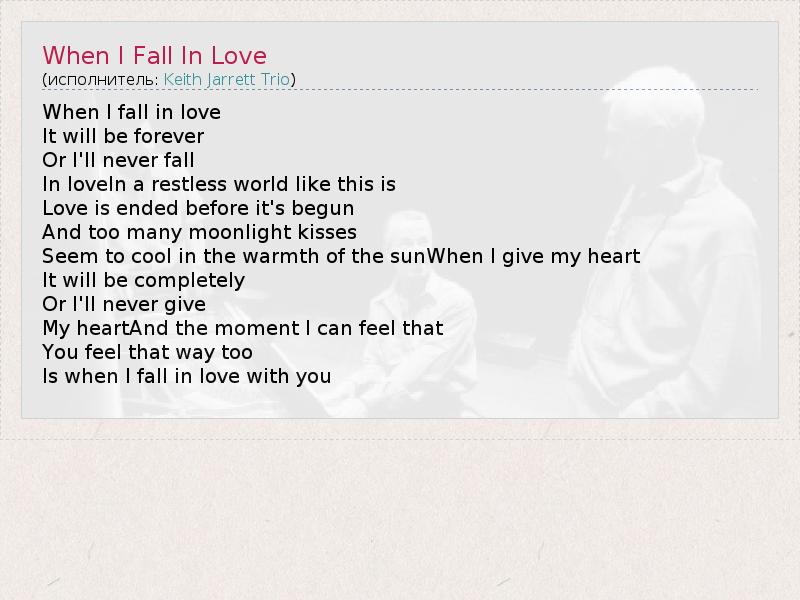When I fall in love It will be forever Or I'll never fall In loveIn a restless world like this is Love is ended before it's begun And too many moonlight kisses Seem to cool in the warmth of the sunWhen I give my heart It will be completely Or I'll never give My heartAnd the moment I can feel that You feel that way too Is when I fall in love with you