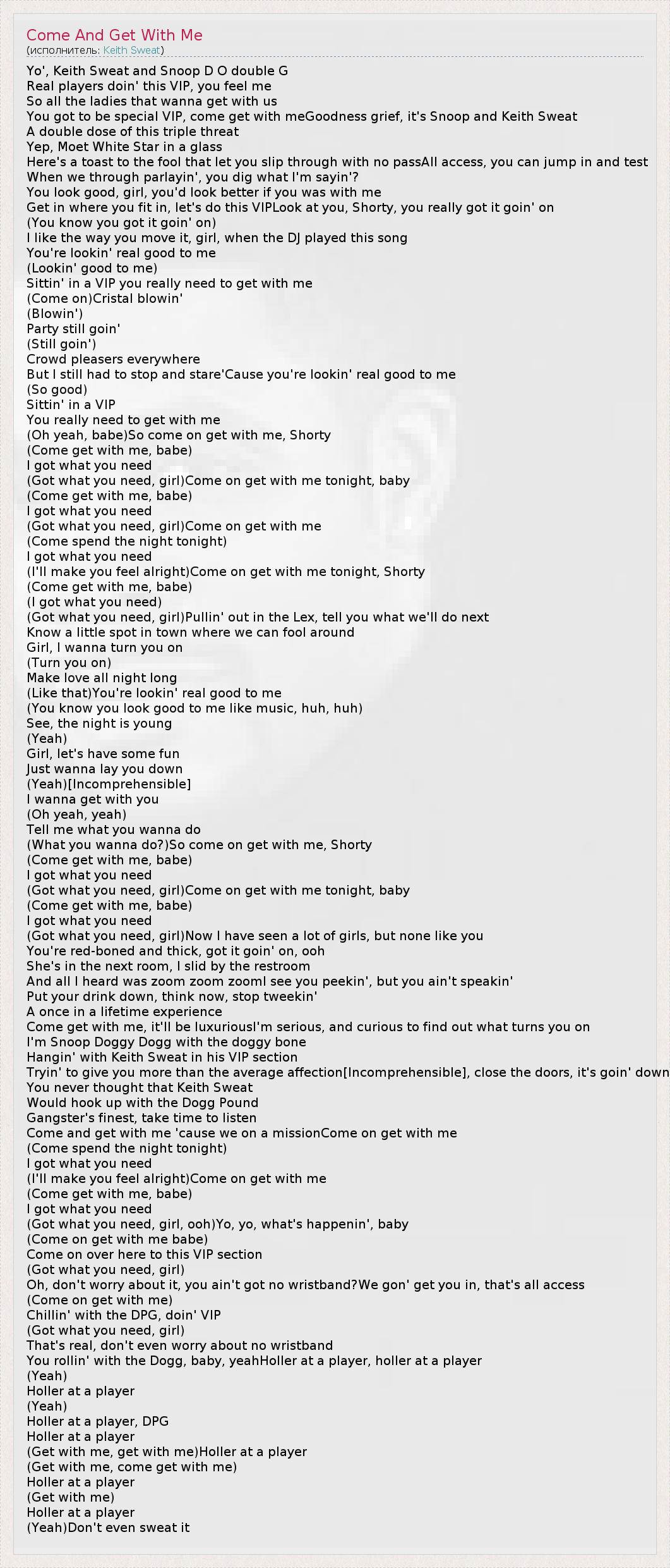 Yo', Keith Sweat and Snoop D O double G Real players doin' this VIP, you feel me So all the ladies that wanna get with us You got to be special VIP, come get with meGoodness grief, it's Snoop and Keith Sweat A double dose of this triple threat Yep, Moet White Star in a glass Here's a toast to the fool that let you slip through with no passAll access, you can jump in and test When we through parlayin', you dig what I'm sayin'? You look good, girl, you'd look better if you was with me Get in where you fit in, let's do this VIPLook at you, Shorty, you really got it goin' on (You know you got it goin' on) I like the way you move it, girl, when the DJ played this song You're lookin' real good to me (Lookin' good to me) Sittin' in a VIP you really need to get with me (Come on)Cristal blowin' (Blowin') Party still goin' (Still goin') Crowd pleasers everywhere But I still had to stop and stare'Cause you're lookin' real good to me (So good) Sittin' in a VIP You really need to get with me (Oh yeah, babe)So come on get with me, Shorty (Come get with me, babe) I got what you need (Got what you need, girl)Come on get with me tonight, baby (Come get with me, babe) I got what you need (Got what you need, girl)Come on get with me (Come spend the night tonight) I got what you need (I'll make you feel alright)Come on get with me tonight, Shorty (Come get with me, babe) (I got what you need) (Got what you need, girl)Pullin' out in the Lex, tell you what we'll do next Know a little spot in town where we can fool around Girl, I wanna turn you on (Turn you on) Make love all night long (Like that)You're lookin' real good to me (You know you look good to me like music, huh, huh) See, the night is young (Yeah) Girl, let's have some fun Just wanna lay you down (Yeah)[Incomprehensible] I wanna get with you (Oh yeah, yeah) Tell me what you wanna do (What you wanna do?)So come on get with me, Shorty (Come get with me, babe) I got what you need (Got what you need, girl)Come on get with me tonight, baby (Come get with me, babe) I got what you need (Got what you need, girl)Now I have seen a lot of girls, but none like you You're red-boned and thick, got it goin' on, ooh She's in the next room, I slid by the restroom And all I heard was zoom zoom zoomI see you peekin', but you ain't speakin' Put your drink down, think now, stop tweekin' A once in a lifetime experience Come get with me, it'll be luxuriousI'm serious, and curious to find out what turns you on I'm Snoop Doggy Dogg with the doggy bone Hangin' with Keith Sweat in his VIP section Tryin' to give you more than the average affection[Incomprehensible], close the doors, it's goin' down You never thought that Keith Sweat Would hook up with the Dogg Pound Gangster's finest, take time to listen Come and get with me 'cause we on a missionCome on get with me (Come spend the night tonight) I got what you need (I'll make you feel alright)Come on get with me (Come get with me, babe) I got what you need (Got what you need, girl, ooh)Yo, yo, what's happenin', baby (Come on get with me babe) Come on over here to this VIP section (Got what you need, girl) Oh, don't worry about it, you ain't got no wristband?We gon' get you in, that's all access (Come on get with me) Chillin' with the DPG, doin' VIP (Got what you need, girl) That's real, don't even worry about no wristband You rollin' with the Dogg, baby, yeahHoller at a player, holler at a player (Yeah) Holler at a player (Yeah) Holler at a player, DPG Holler at a player (Get with me, get with me)Holler at a player (Get with me, come get with me) Holler at a player (Get with me) Holler at a player (Yeah)Don't even sweat it
