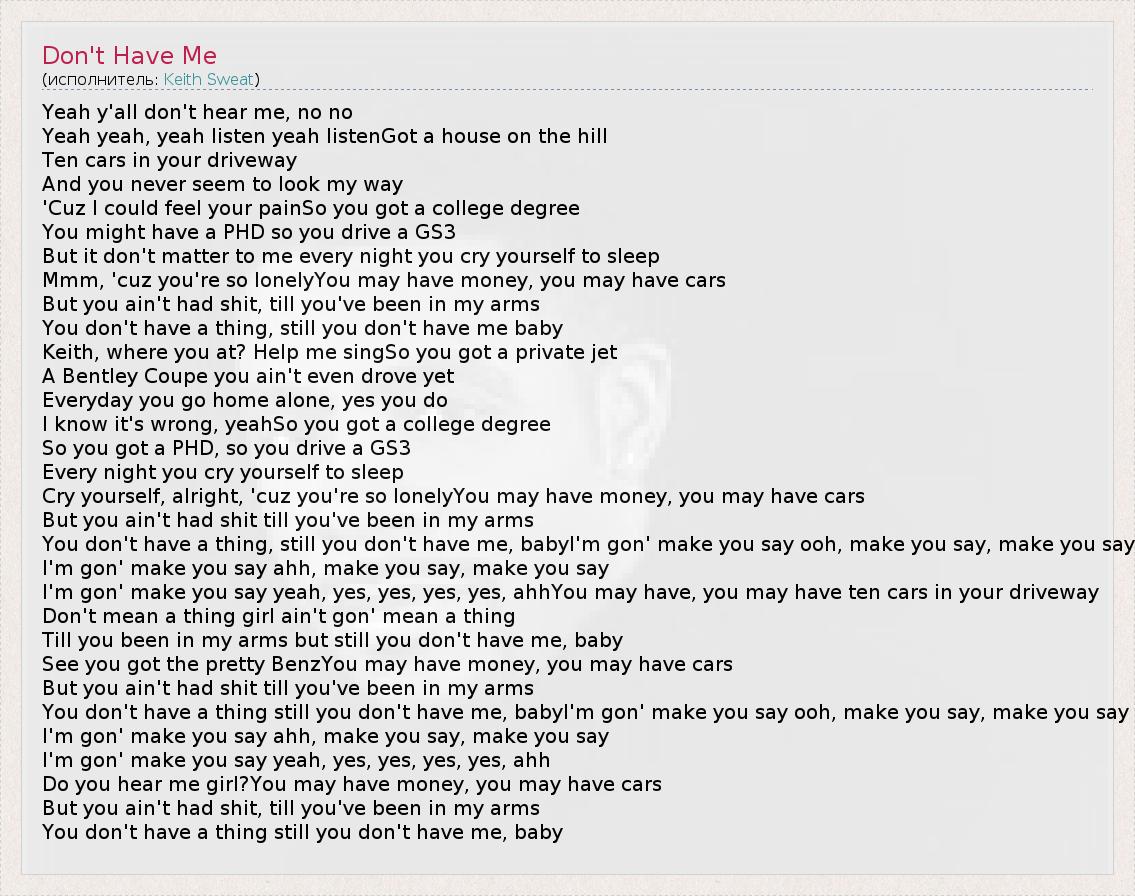 Yeah y'all don't hear me, no no Yeah yeah, yeah listen yeah listenGot a house on the hill Ten cars in your driveway And you never seem to look my way 'Cuz I could feel your painSo you got a college degree You might have a PHD so you drive a GS3 But it don't matter to me every night you cry yourself to sleep Mmm, 'cuz you're so lonelyYou may have money, you may have cars But you ain't had shit, till you've been in my arms You don't have a thing, still you don't have me baby Keith, where you at? Help me singSo you got a private jet A Bentley Coupe you ain't even drove yet Everyday you go home alone, yes you do I know it's wrong, yeahSo you got a college degree So you got a PHD, so you drive a GS3 Every night you cry yourself to sleep Cry yourself, alright, 'cuz you're so lonelyYou may have money, you may have cars But you ain't had shit till you've been in my arms You don't have a thing, still you don't have me, babyI'm gon' make you say ooh, make you say, make you say I'm gon' make you say ahh, make you say, make you say I'm gon' make you say yeah, yes, yes, yes, yes, ahhYou may have, you may have ten cars in your driveway Don't mean a thing girl ain't gon' mean a thing Till you been in my arms but still you don't have me, baby See you got the pretty BenzYou may have money, you may have cars But you ain't had shit till you've been in my arms You don't have a thing still you don't have me, babyI'm gon' make you say ooh, make you say, make you say I'm gon' make you say ahh, make you say, make you say I'm gon' make you say yeah, yes, yes, yes, yes, ahh Do you hear me girl?You may have money, you may have cars But you ain't had shit, till you've been in my arms You don't have a thing still you don't have me, baby