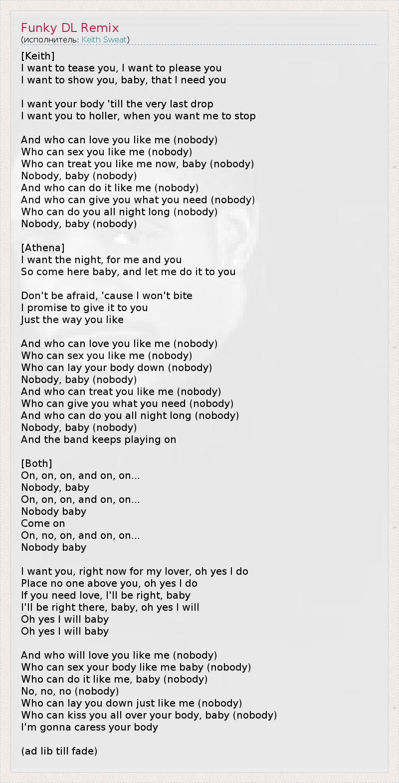 [Keith] I want to tease you, I want to please you I want to show you, baby, that I need you I want your body 'till the very last drop I want you to holler, when you want me to stop And who can love you like me (nobody) Who can sex you like me (nobody) Who can treat you like me now, baby (nobody) Nobody, baby (nobody) And who can do it like me (nobody) And who can give you what you need (nobody) Who can do you all night long (nobody) Nobody, baby (nobody) [Athena] I want the night, for me and you So come here baby, and let me do it to you Don't be afraid, 'cause I won't bite I promise to give it to you Just the way you like And who can love you like me (nobody) Who can sex you like me (nobody) Who can lay your body down (nobody) Nobody, baby (nobody) And who can treat you like me (nobody) Who can give you what you need (nobody) And who can do you all night long (nobody) Nobody, baby (nobody) And the band keeps playing on [Both] On, on, on, and on, on... Nobody, baby On, on, on, and on, on... Nobody baby Come on On, no, on, and on, on... Nobody baby I want you, right now for my lover, oh yes I do Place no one above you, oh yes I do If you need love, I'll be right, baby I'll be right there, baby, oh yes I will Oh yes I will baby Oh yes I will baby And who will love you like me (nobody) Who can sex your body like me baby (nobody) Who can do it like me, baby (nobody) No, no, no (nobody) Who can lay you down just like me (nobody) Who can kiss you all over your body, baby (nobody) I'm gonna caress your body (ad lib till fade)