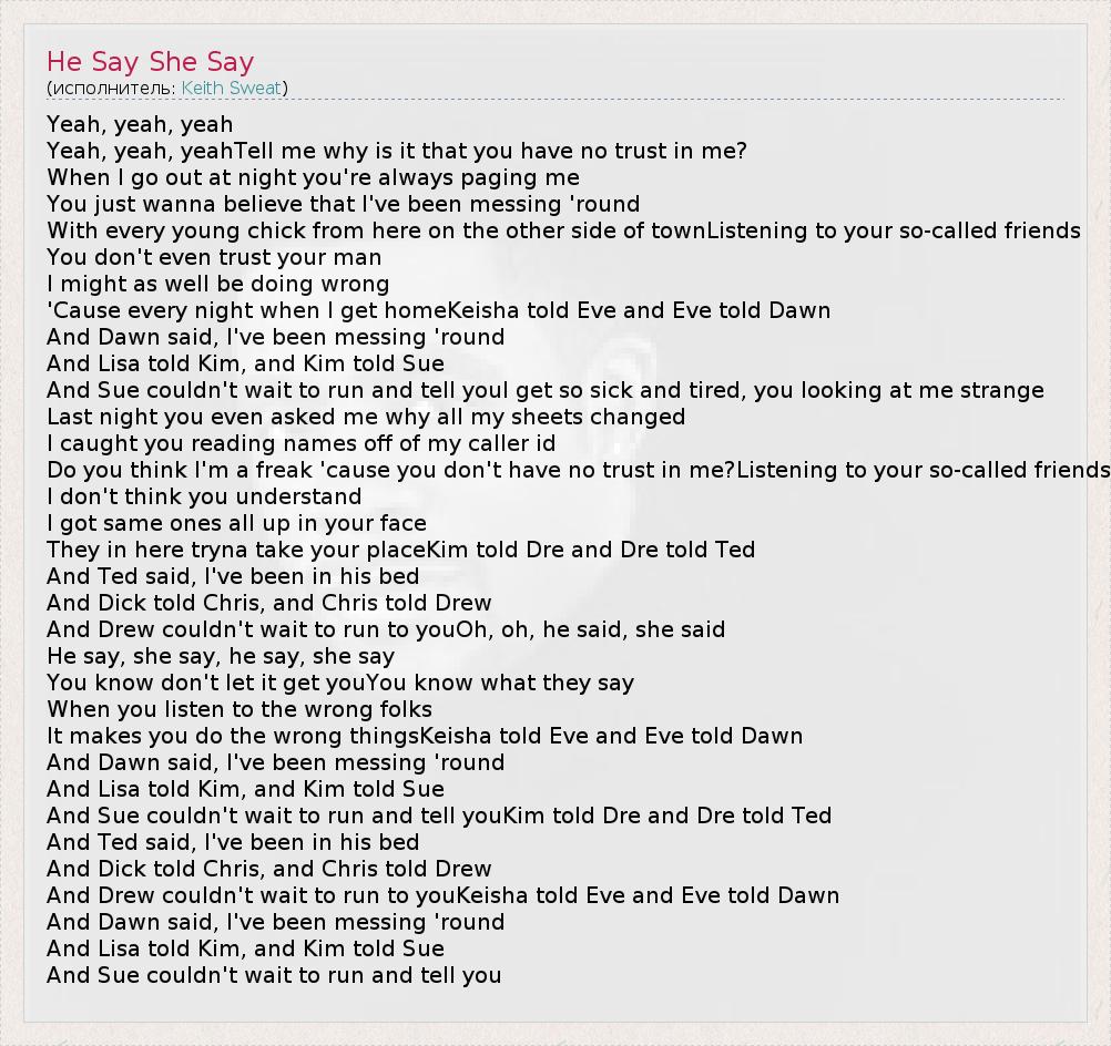 Yeah, yeah, yeah Yeah, yeah, yeahTell me why is it that you have no trust in me? When I go out at night you're always paging me You just wanna believe that I've been messing 'round With every young chick from here on the other side of townListening to your so-called friends You don't even trust your man I might as well be doing wrong 'Cause every night when I get homeKeisha told Eve and Eve told Dawn And Dawn said, I've been messing 'round And Lisa told Kim, and Kim told Sue And Sue couldn't wait to run and tell youI get so sick and tired, you looking at me strange Last night you even asked me why all my sheets changed I caught you reading names off of my caller id Do you think I'm a freak 'cause you don't have no trust in me?Listening to your so-called friends I don't think you understand I got same ones all up in your face They in here tryna take your placeKim told Dre and Dre told Ted And Ted said, I've been in his bed And Dick told Chris, and Chris told Drew And Drew couldn't wait to run to youOh, oh, he said, she said He say, she say, he say, she say You know don't let it get youYou know what they say When you listen to the wrong folks It makes you do the wrong thingsKeisha told Eve and Eve told Dawn And Dawn said, I've been messing 'round And Lisa told Kim, and Kim told Sue And Sue couldn't wait to run and tell youKim told Dre and Dre told Ted And Ted said, I've been in his bed And Dick told Chris, and Chris told Drew And Drew couldn't wait to run to youKeisha told Eve and Eve told Dawn And Dawn said, I've been messing 'round And Lisa told Kim, and Kim told Sue And Sue couldn't wait to run and tell you