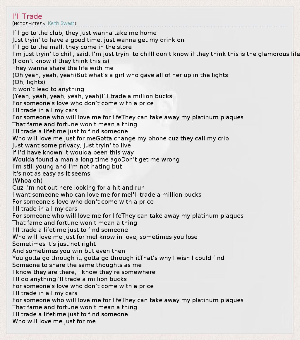 If I go to the club, they just wanna take me home Just tryin' to have a good time, just wanna get my drink on If I go to the mall, they come in the store I'm just tryin' to chill, said, I'm just tryin' to chillI don't know if they think this is the glamorous life (I don't know if they think this is) They wanna share the life with me (Oh yeah, yeah, yeah)But what's a girl who gave all of her up in the lights (Oh, lights) It won't lead to anything (Yeah, yeah, yeah, yeah, yeah)I'll trade a million bucks For someone's love who don't come with a price I'll trade in all my cars For someone who will love me for lifeThey can take away my platinum plaques That fame and fortune won't mean a thing I'll trade a lifetime just to find someone Who will love me just for meGotta change my phone cuz they call my crib Just want some privacy, just tryin' to live If I'd have known it woulda been this way Woulda found a man a long time agoDon't get me wrong I'm still young and I'm not hating but It's not as easy as it seems (Whoa oh) Cuz I'm not out here looking for a hit and run I want someone who can love me for meI'll trade a million bucks For someone's love who don't come with a price I'll trade in all my cars For someone who will love me for lifeThey can take away my platinum plaques That fame and fortune won't mean a thing I'll trade a lifetime just to find someone Who will love me just for meI know in love, sometimes you lose Sometimes it's just not right And sometimes you win but even then You gotta go through it, gotta go through itThat's why I wish I could find Someone to share the same thoughts as me I know they are there, I know they're somewhere I'll do anythingI'll trade a million bucks For someone's love who don't come with a price I'll trade in all my cars For someone who will love me for lifeThey can take away my platinum plaques That fame and fortune won't mean a thing I'll trade a lifetime just to find someone Who will love me just for me